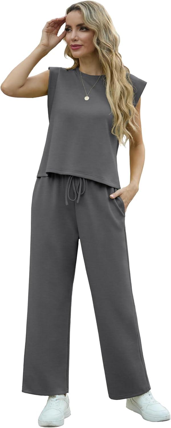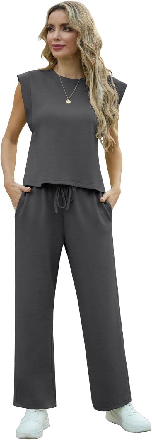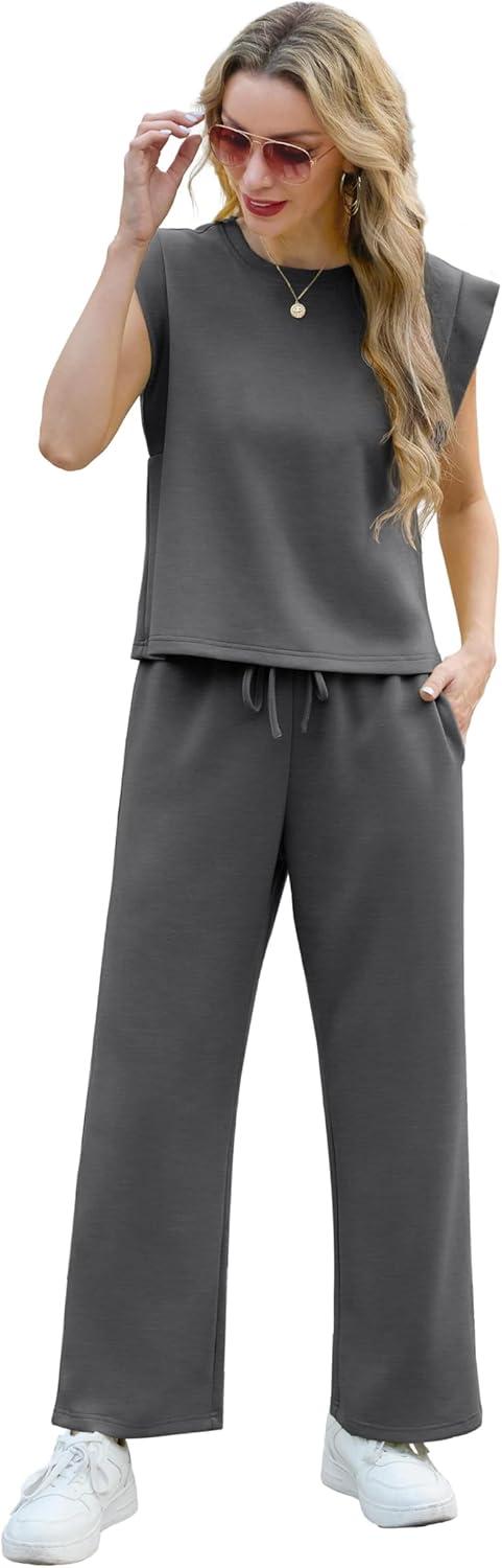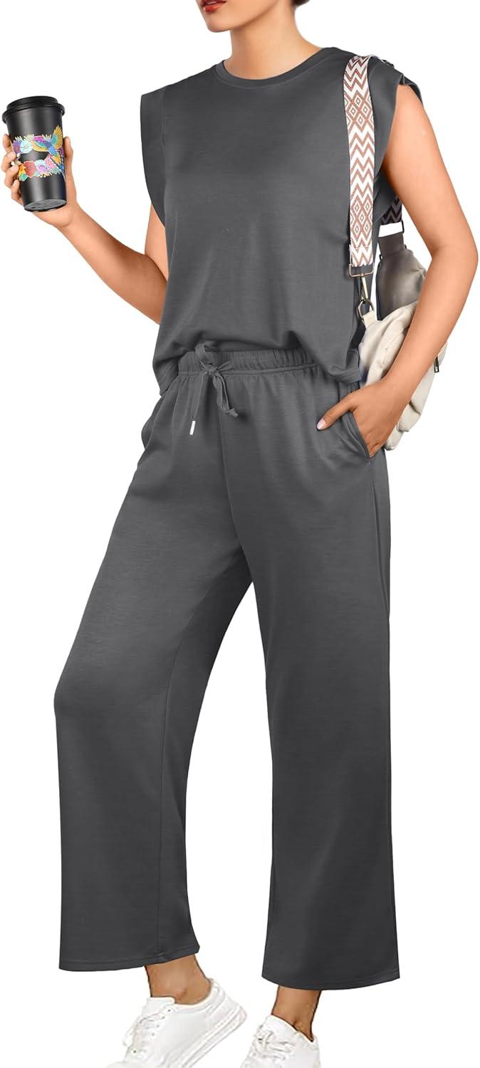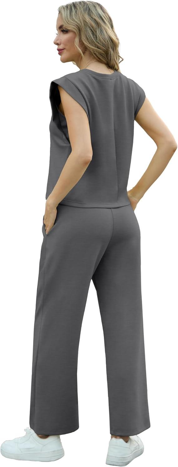 GRECERELLE 2025 Two Piece Sets for Women Summer Round Neck Cap Sleeve Top and Wide Leg Pants with Pockets(Dark Gray)