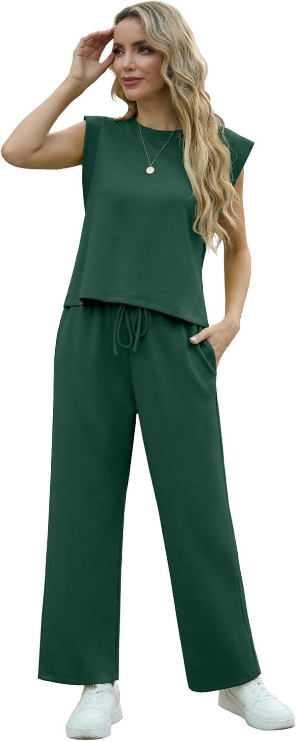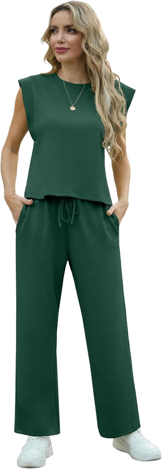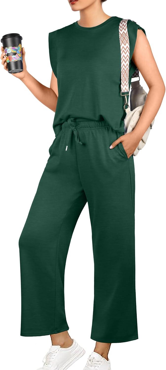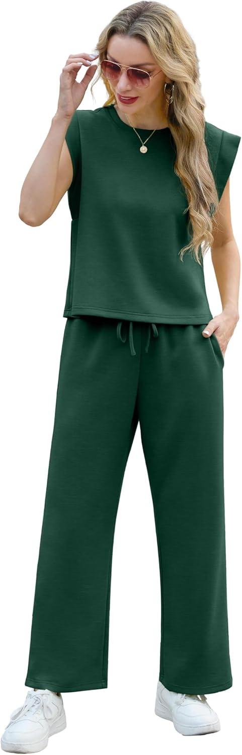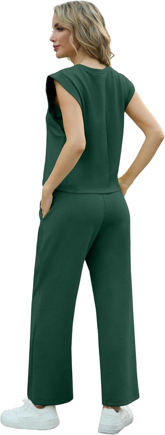 GRECERELLE 2025 Two Piece Sets for Women Summer Round Neck Cap Sleeve Top and Wide Leg Pants with Pockets(Dark Green)