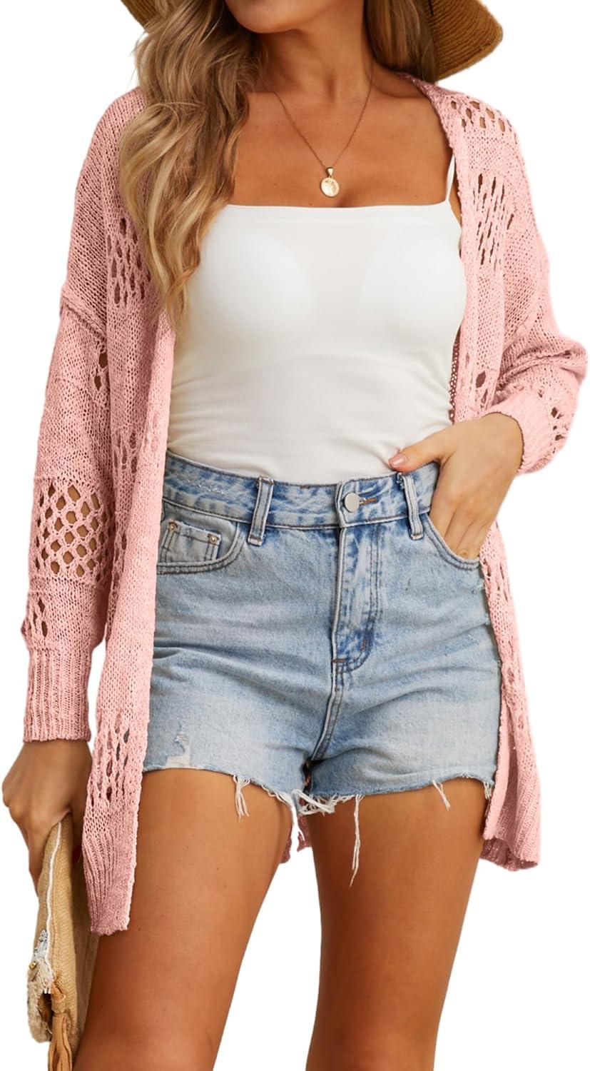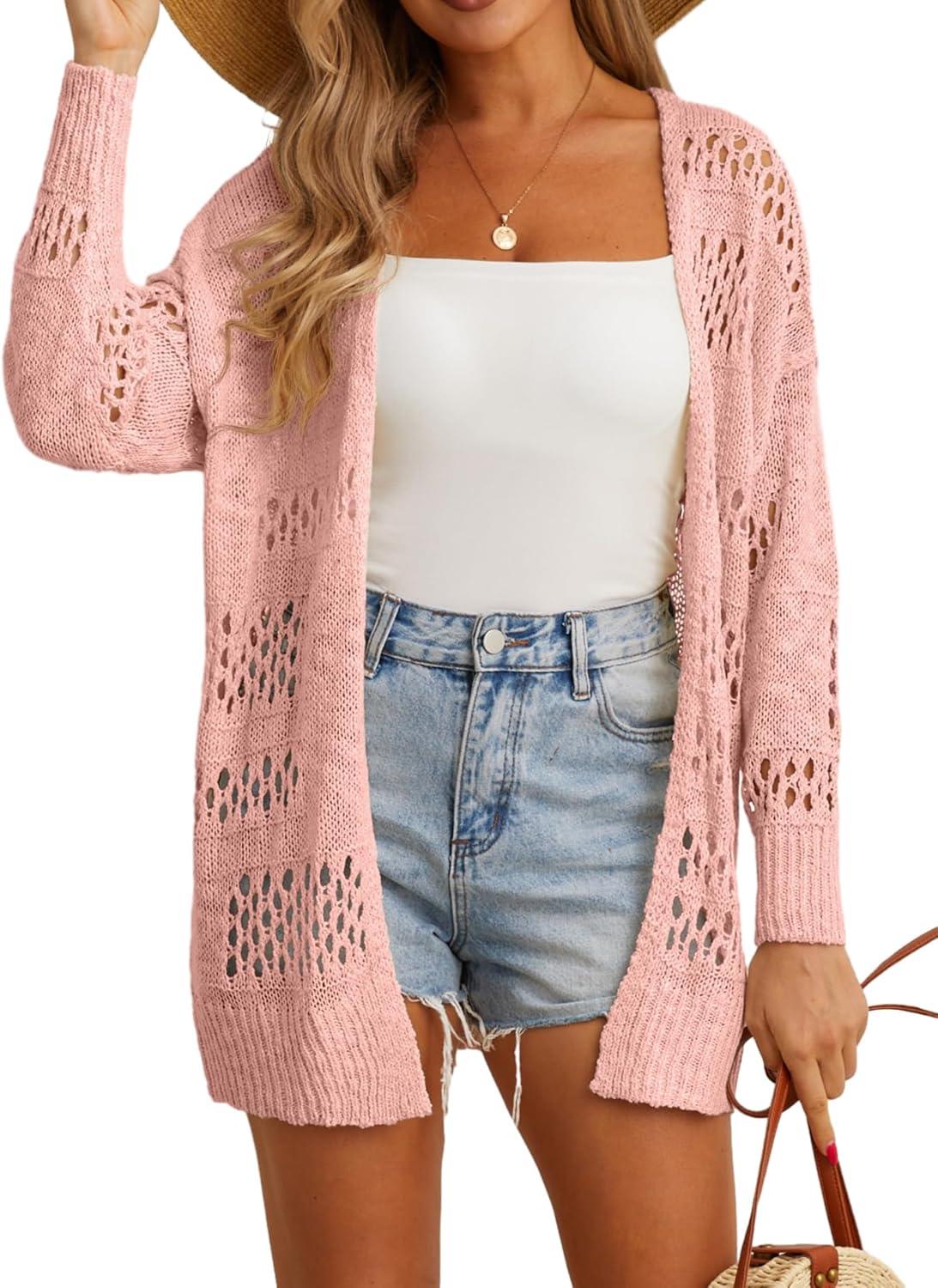 GRECERELLE 2025 Women Summer Crochet Boho Long Sleeve Lightweight Oversized Open Front Cardigan Sweaters Kimonos Tops(Coral Pink)