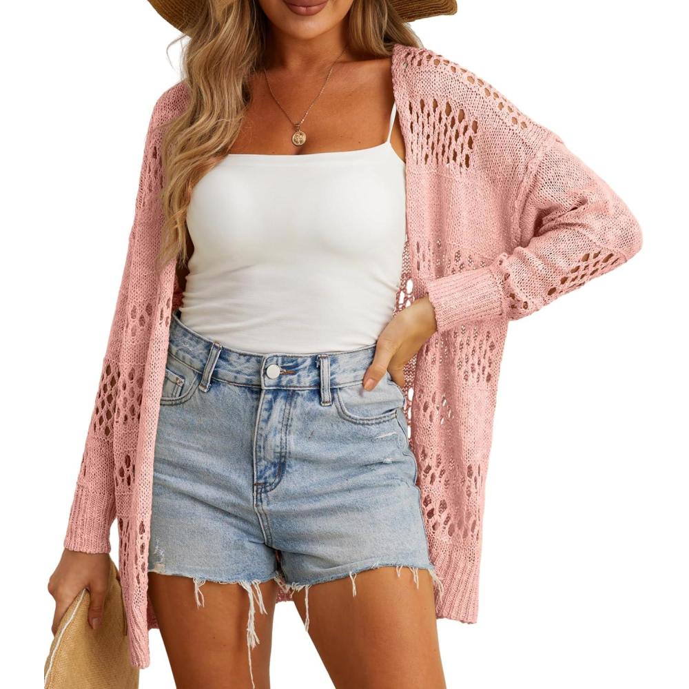 imageGRECERELLE 2025 Women Summer Crochet Boho Long Sleeve Lightweight Oversized Open Front Cardigan Sweaters Kimonos TopsCoral Pink