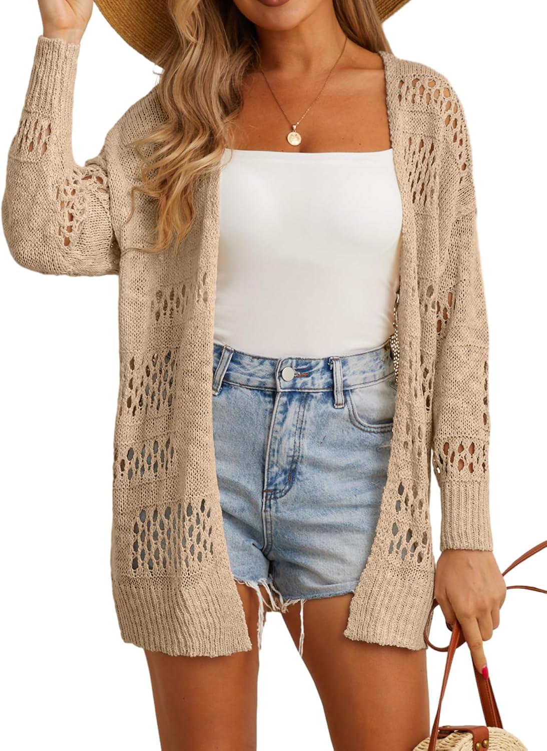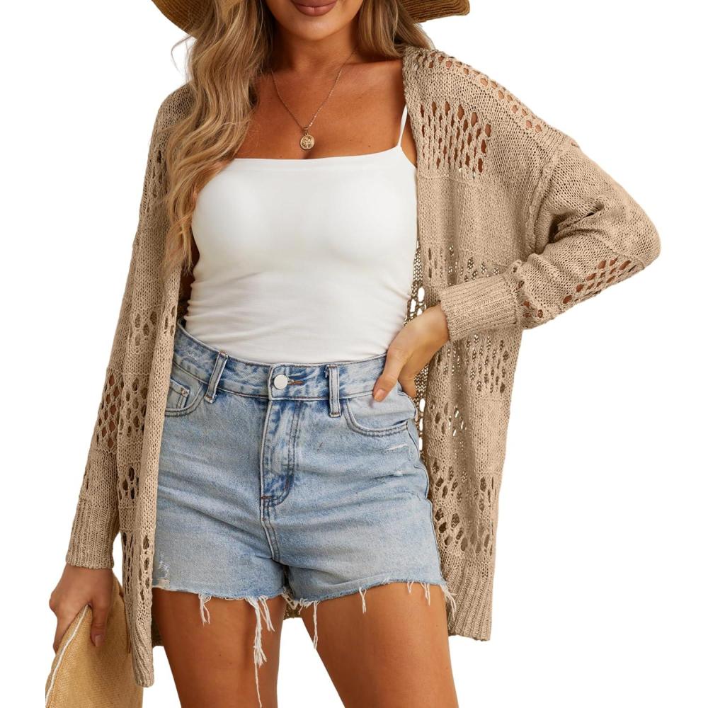 GRECERELLE 2025 Women Summer Crochet Boho Long Sleeve Lightweight Oversized Open Front Cardigan Sweaters Kimonos Tops(Khaki)