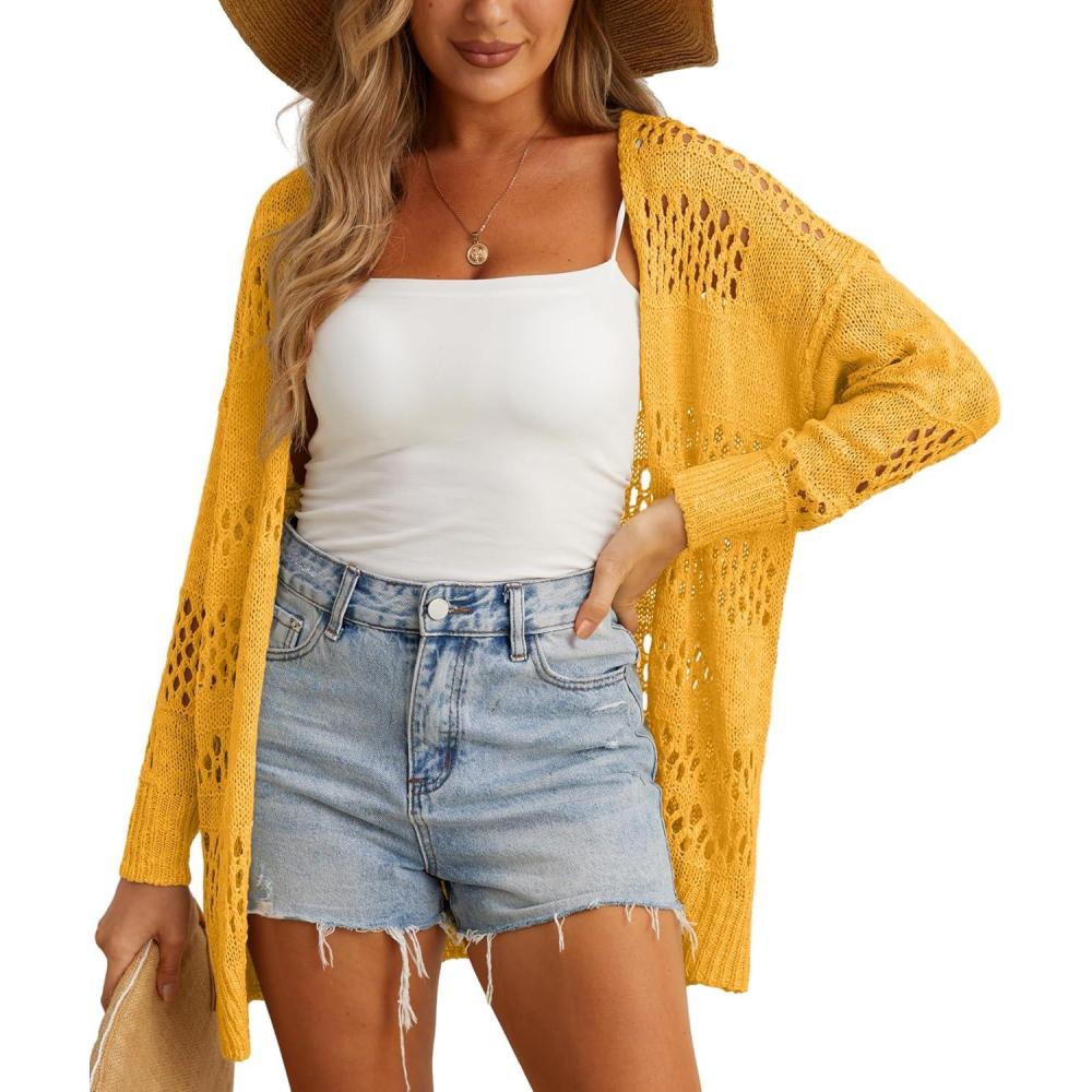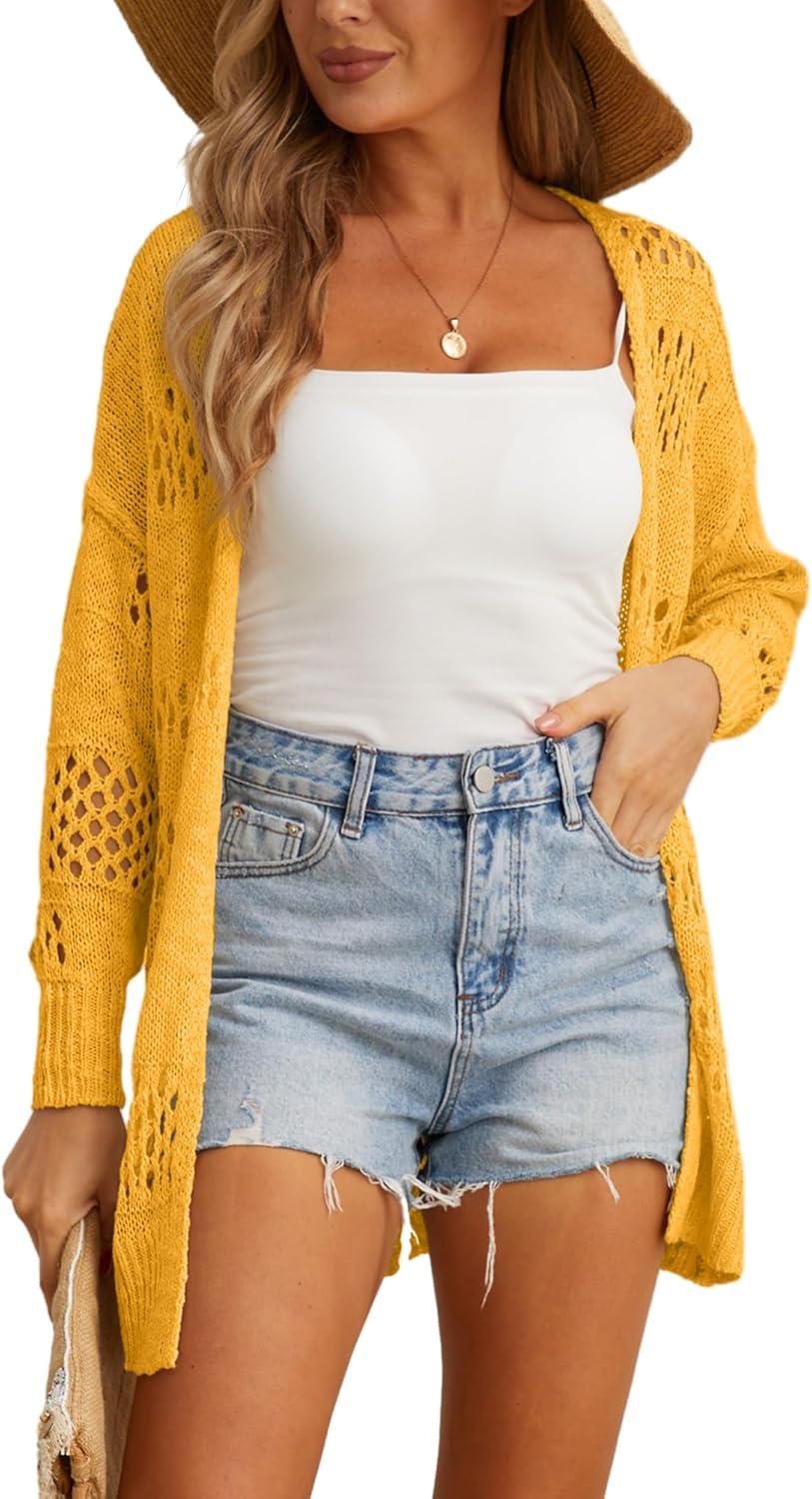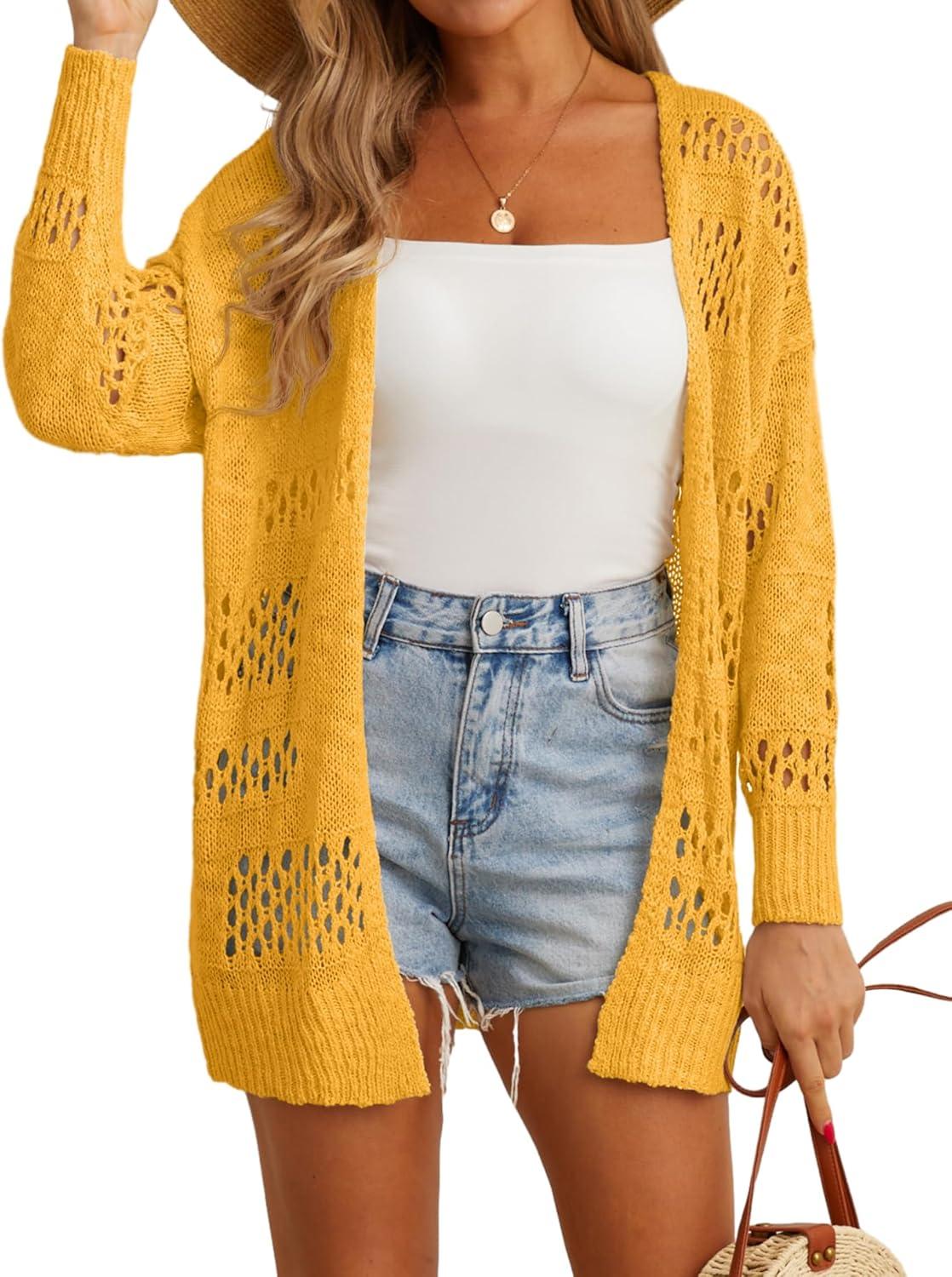 GRECERELLE 2025 Women Summer Crochet Boho Long Sleeve Lightweight Oversized Open Front Cardigan Sweaters Kimonos Tops(Yellow)