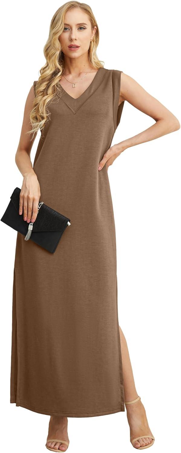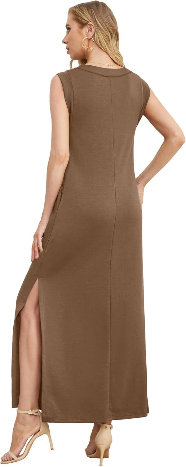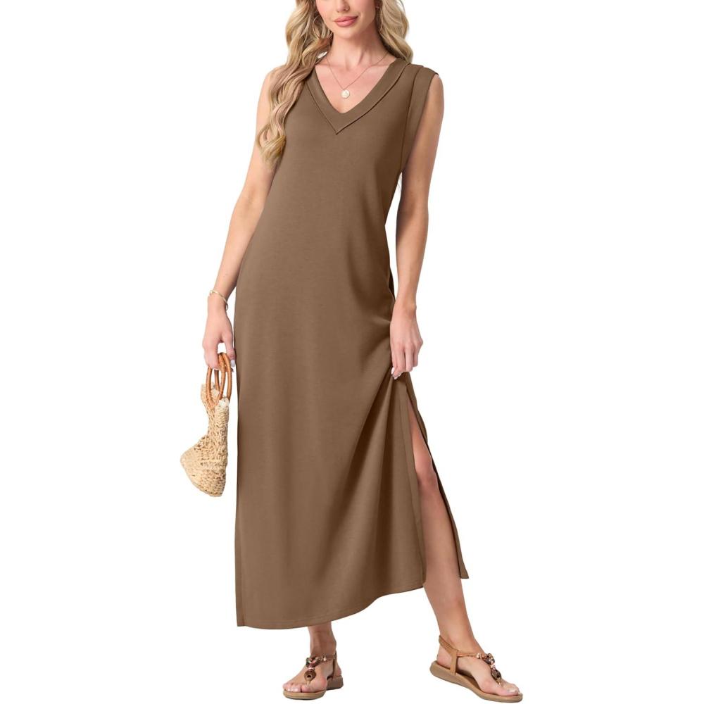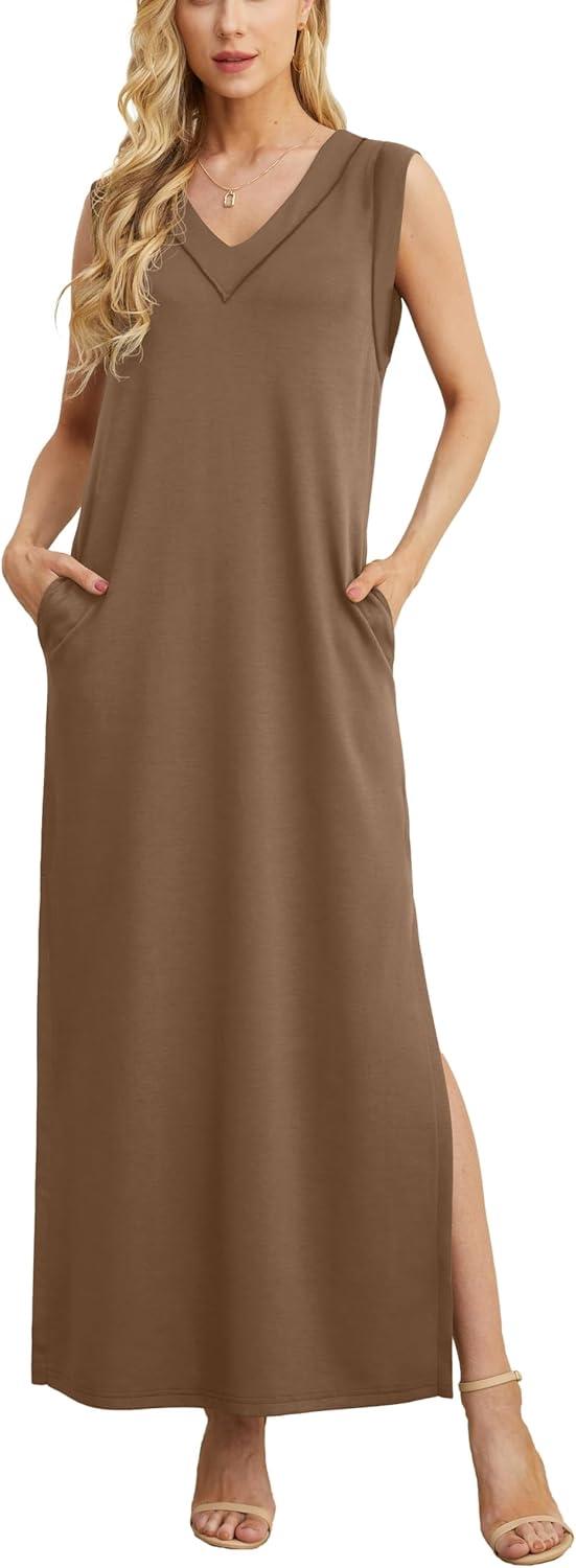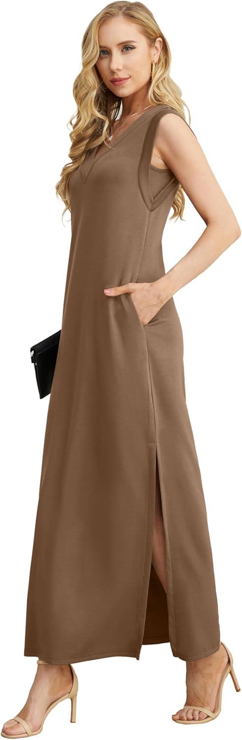 GRECERELLE 2025 Women Summer Inside-Out V-Neck Casual Loose Split Wrinkle-Free Long Maxi Beach Dress with Pockets(Light Coffee)