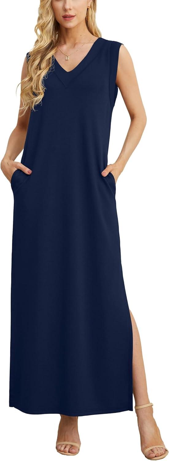 GRECERELLE 2025 Women Summer Inside-Out V-Neck Casual Loose Split Wrinkle-Free Long Maxi Beach Dress with Pockets(Navy Blue)