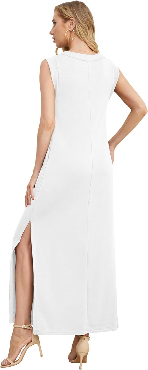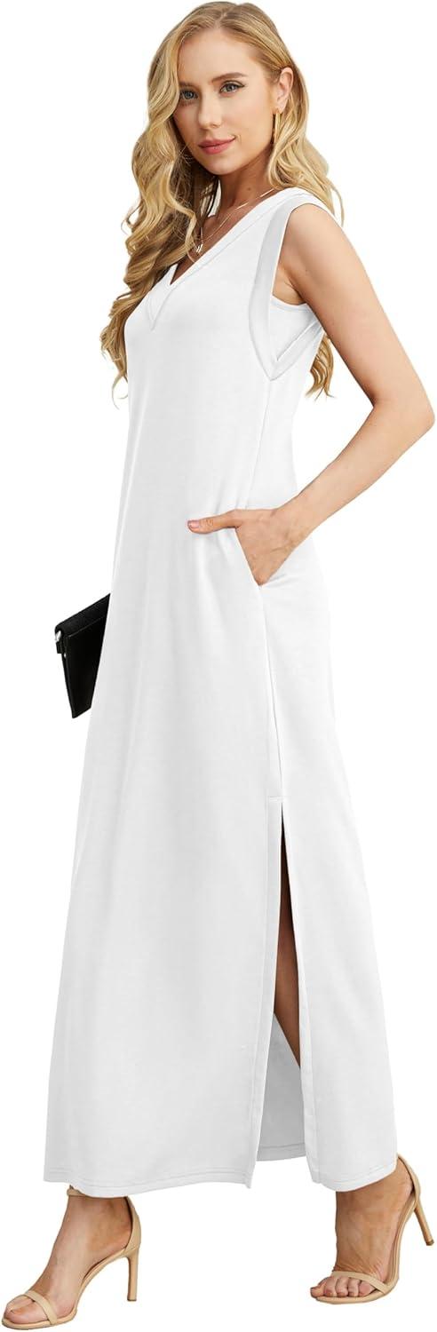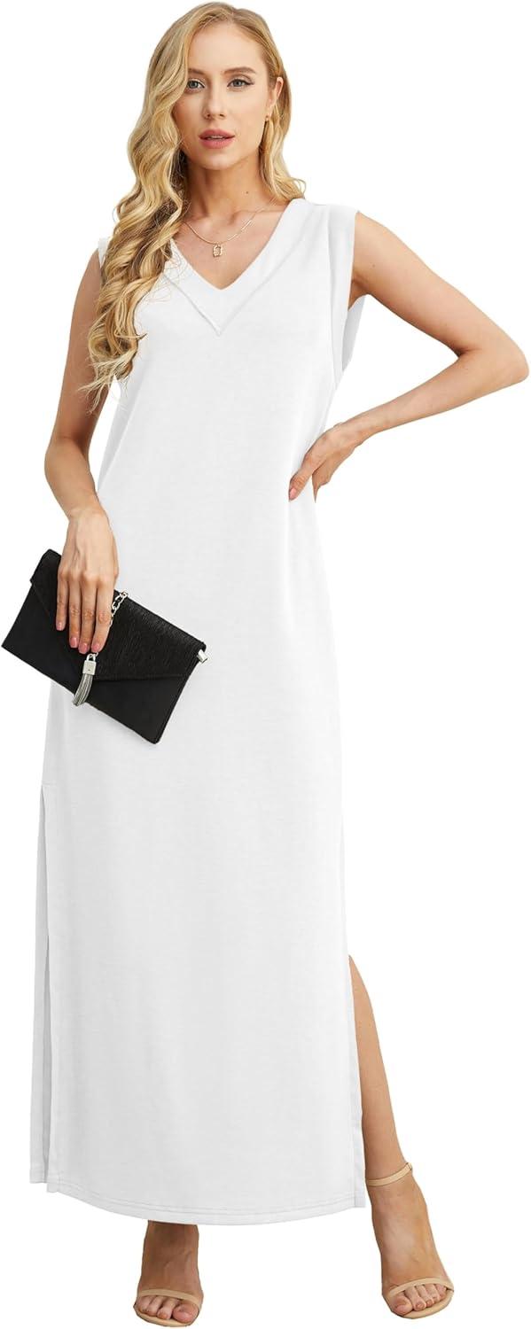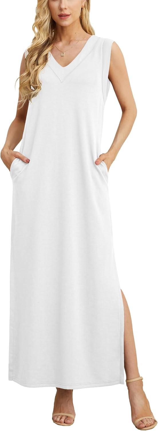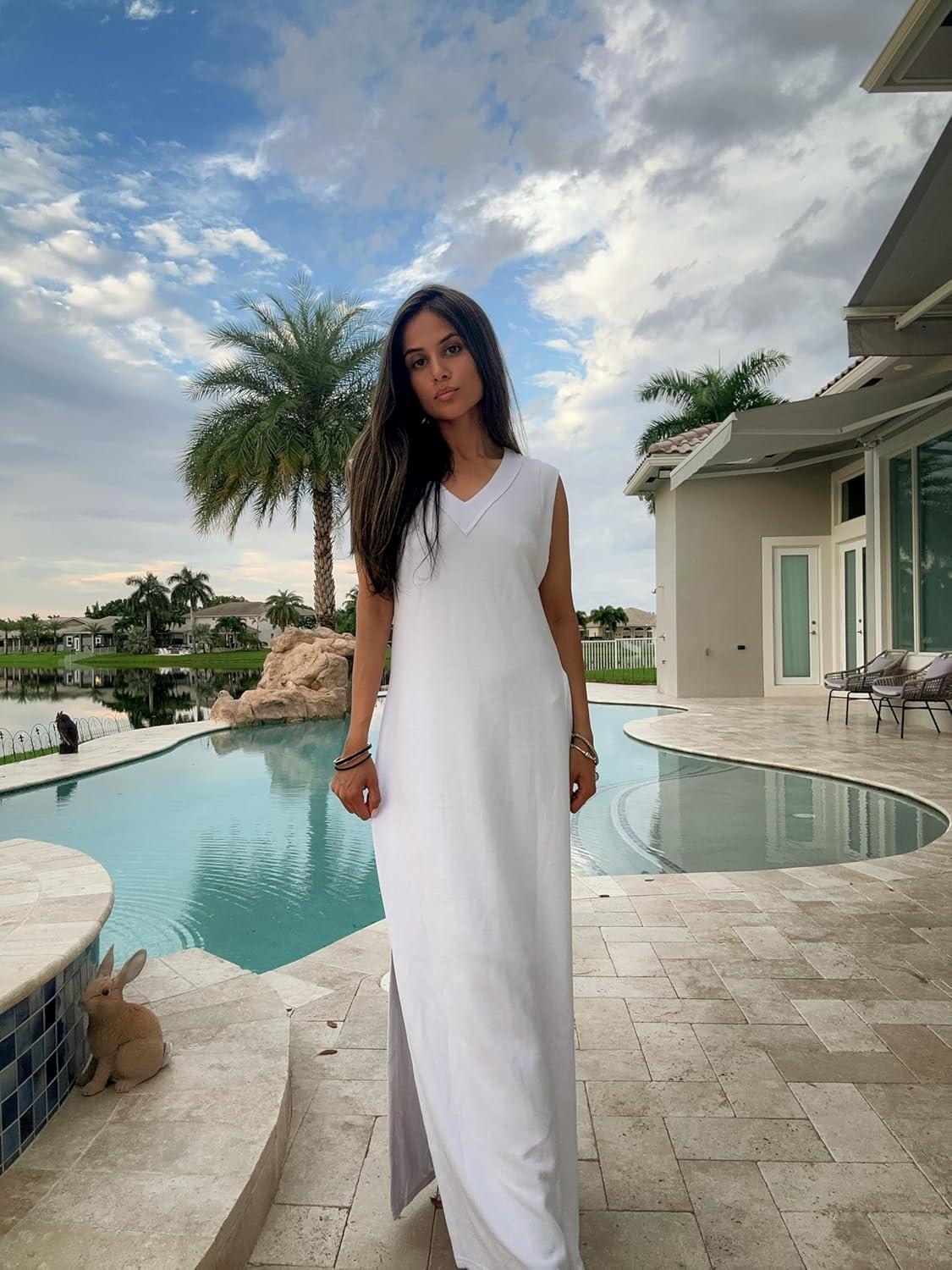 GRECERELLE 2025 Women Summer Inside-Out V-Neck Casual Loose Split Wrinkle-Free Long Maxi Beach Dress with Pockets(White)