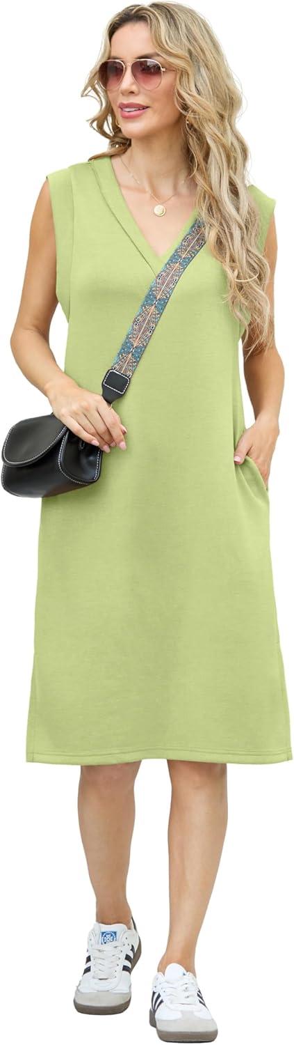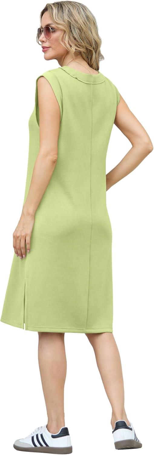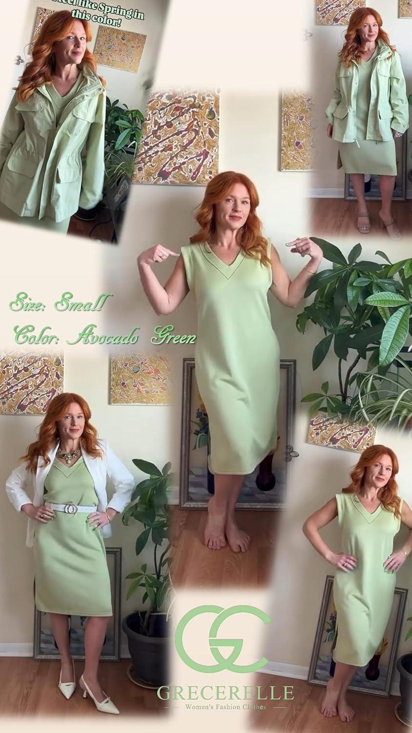 GRECERELLE 2025 Women Summer Inside-Out V-Neck Casual Loose Split Wrinkle-Free Midi Dress with Pockets(Avocado Green)
