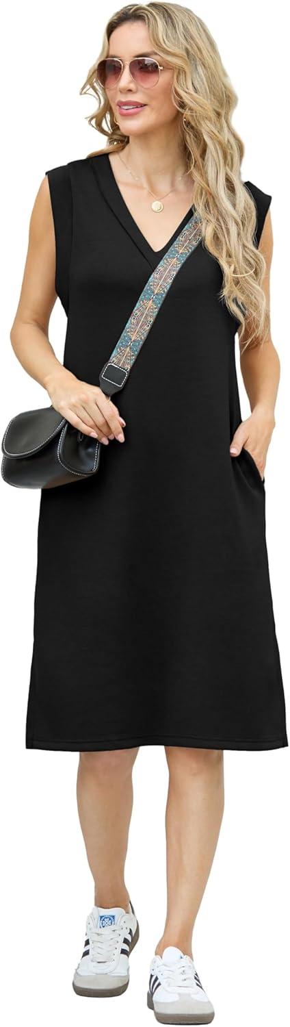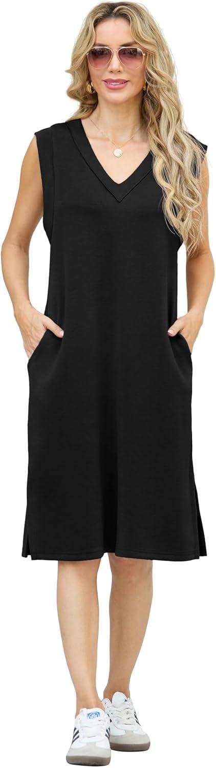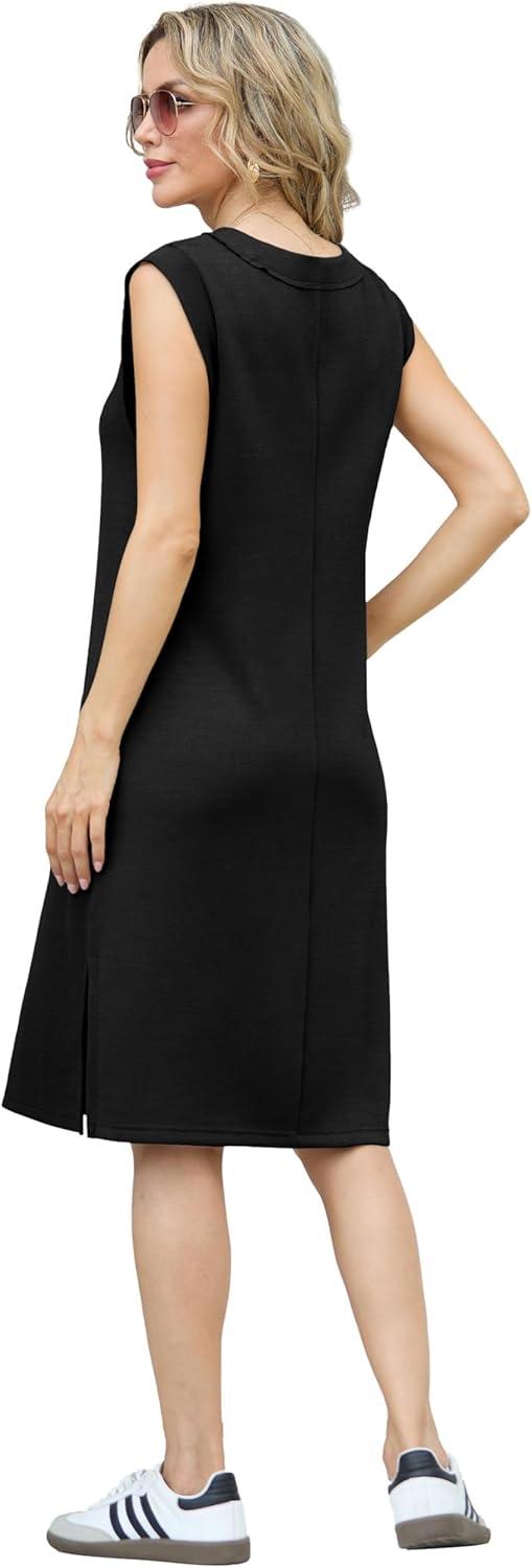 GRECERELLE 2025 Women Summer Inside-Out V-Neck Casual Loose Split Wrinkle-Free Midi Dress with Pockets(Black)