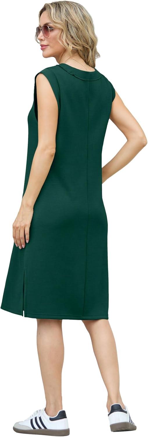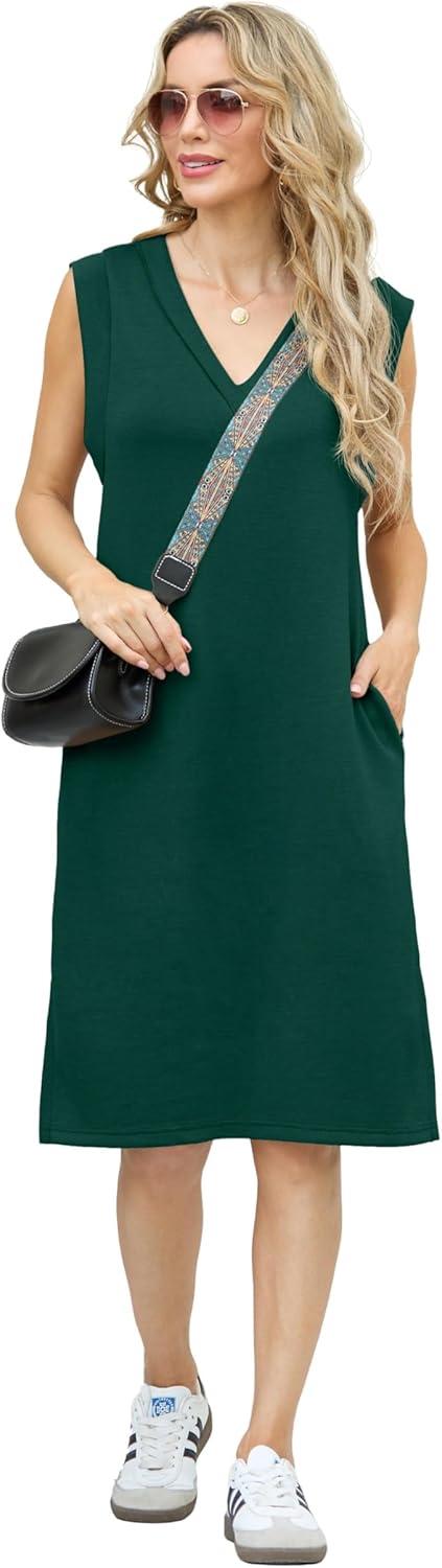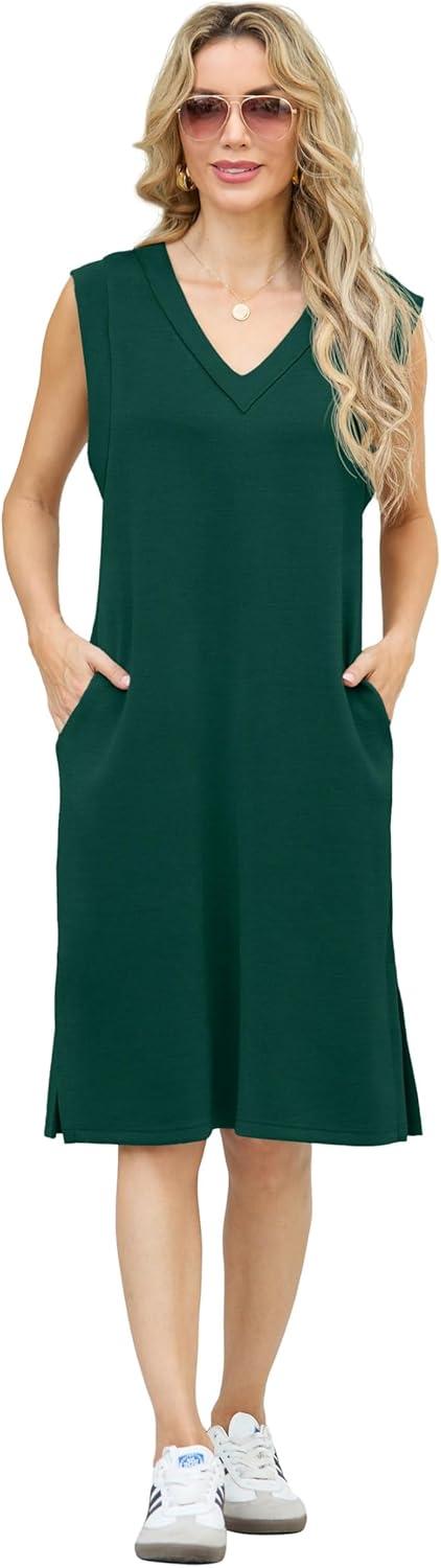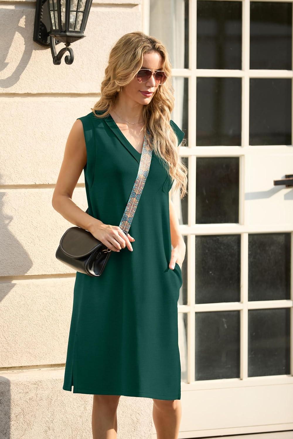 GRECERELLE 2025 Women Summer Inside-Out V-Neck Casual Loose Split Wrinkle-Free Midi Dress with Pockets(Dark Green)
