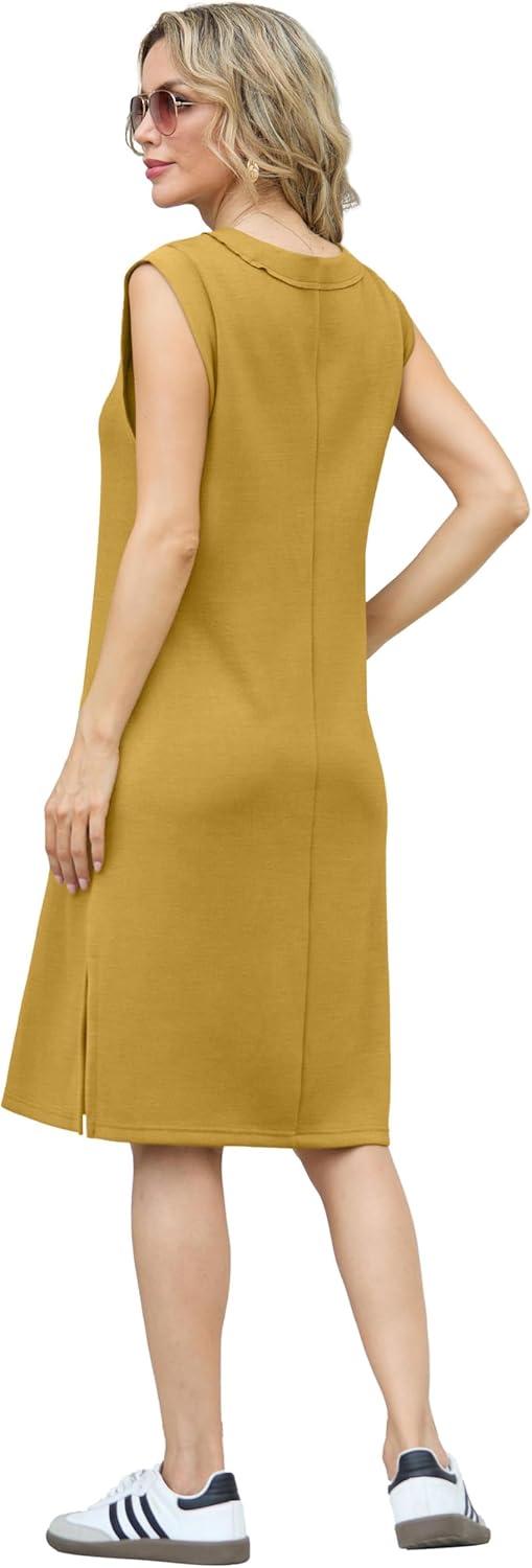 GRECERELLE 2025 Women Summer Inside-Out V-Neck Casual Loose Split Wrinkle-Free Midi Dress with Pockets(Tan)