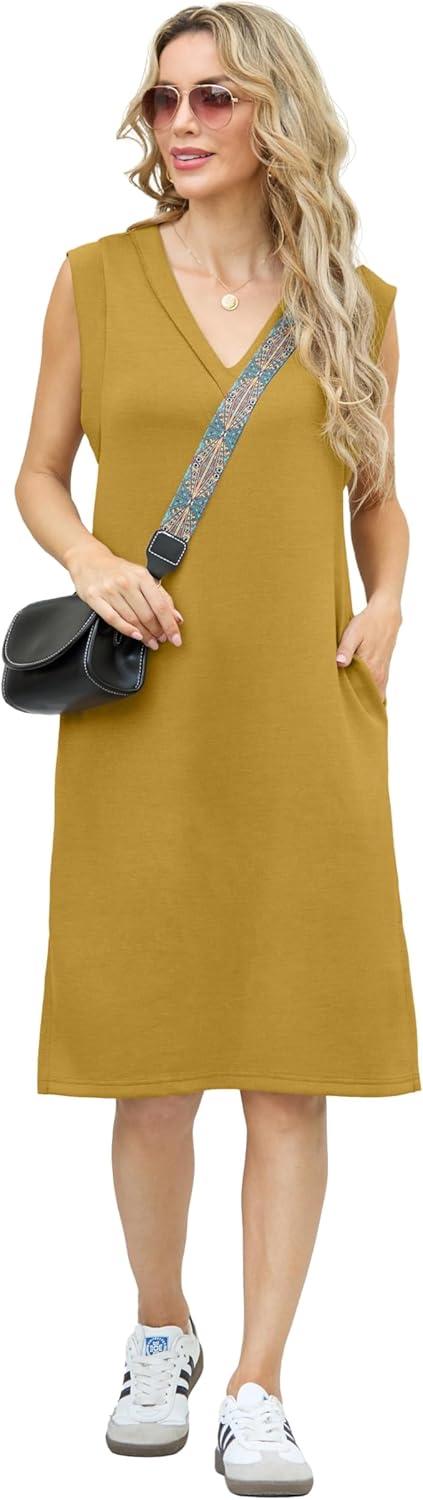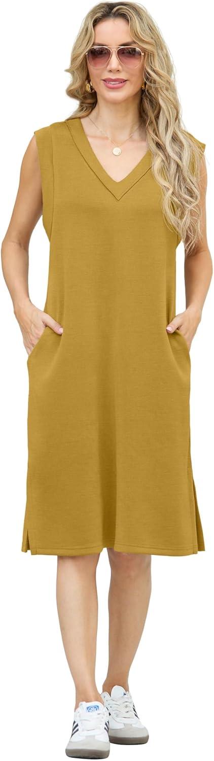 GRECERELLE 2025 Women Summer Inside-Out V-Neck Casual Loose Split Wrinkle-Free Midi Dress with Pockets(Camel)