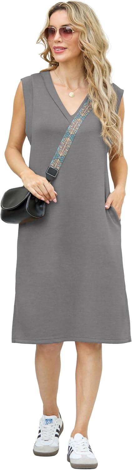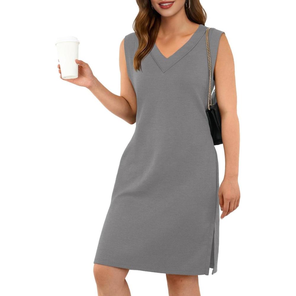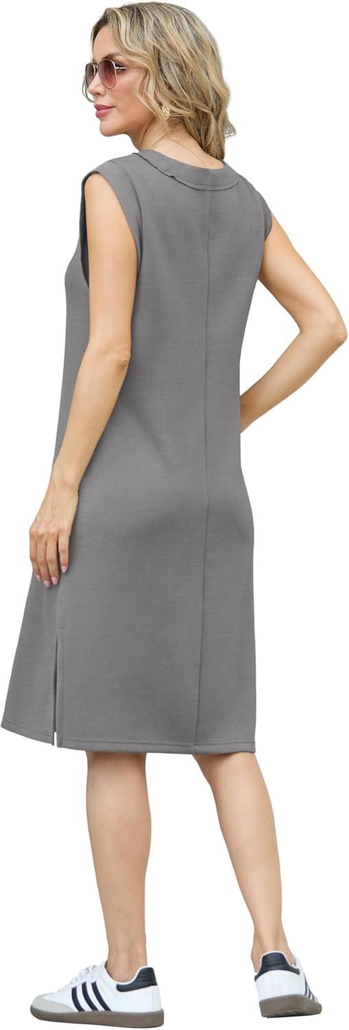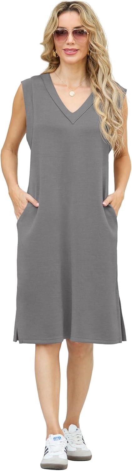 GRECERELLE 2025 Women Summer Inside-Out V-Neck Casual Loose Split Wrinkle-Free Midi Dress with Pockets(Grey)