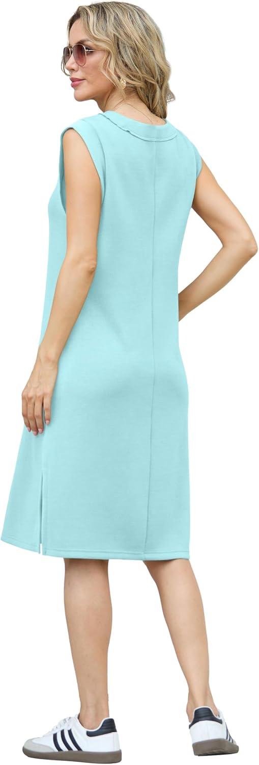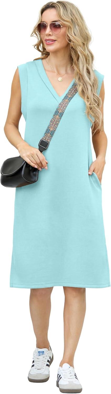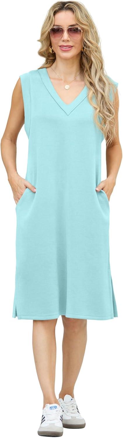 GRECERELLE 2025 Women Summer Inside-Out V-Neck Casual Loose Split Wrinkle-Free Midi Dress with Pockets(Light Blue)