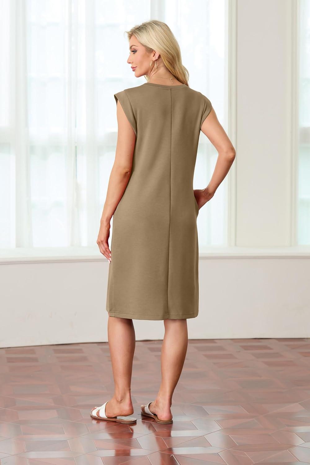 GRECERELLE 2025 Women Summer Round Neck Casual Loose Split Wrinkle-Free Midi Dress with Pockets (XS-3XL)(Brown)
