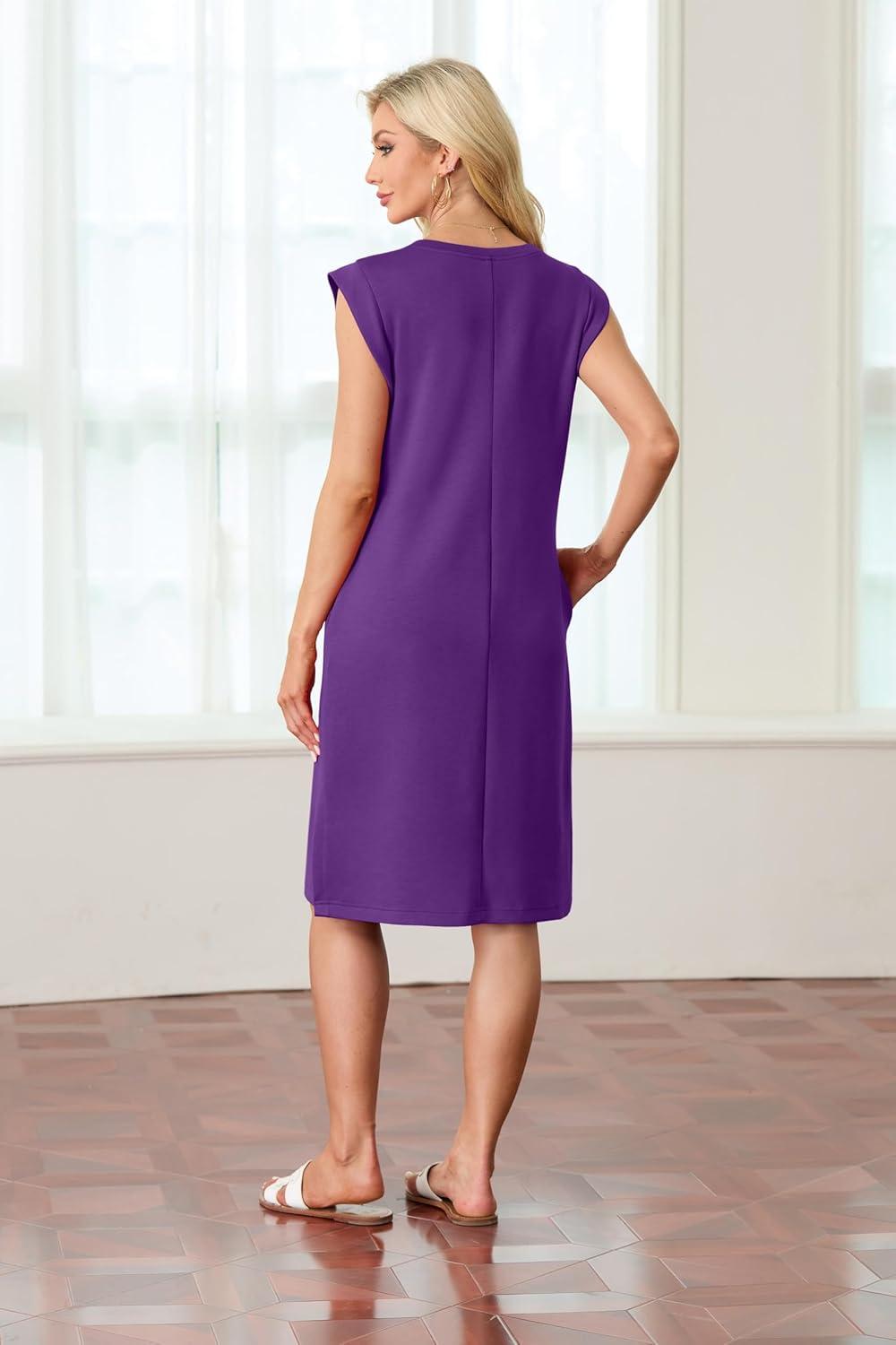 GRECERELLE 2025 Women Summer Round Neck Casual Loose Split Wrinkle-Free Midi Dress with Pockets (XS-3XL)(Dark Purple)