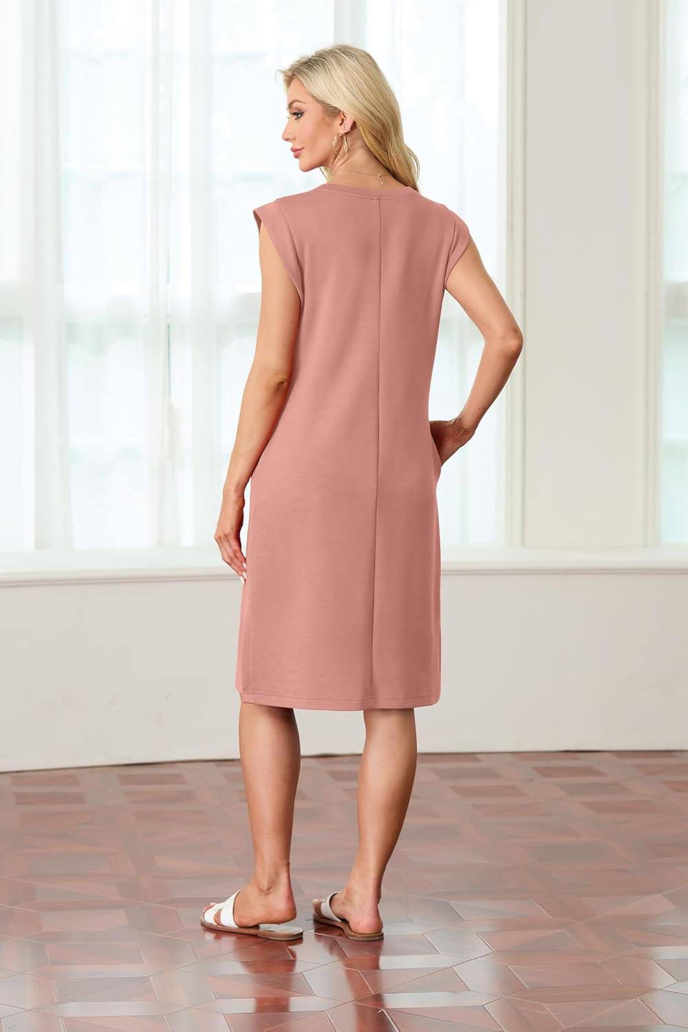GRECERELLE 2025 Women Summer Round Neck Casual Loose Split Wrinkle-Free Midi Dress with Pockets (XS-3XL)(Deep Pink)
