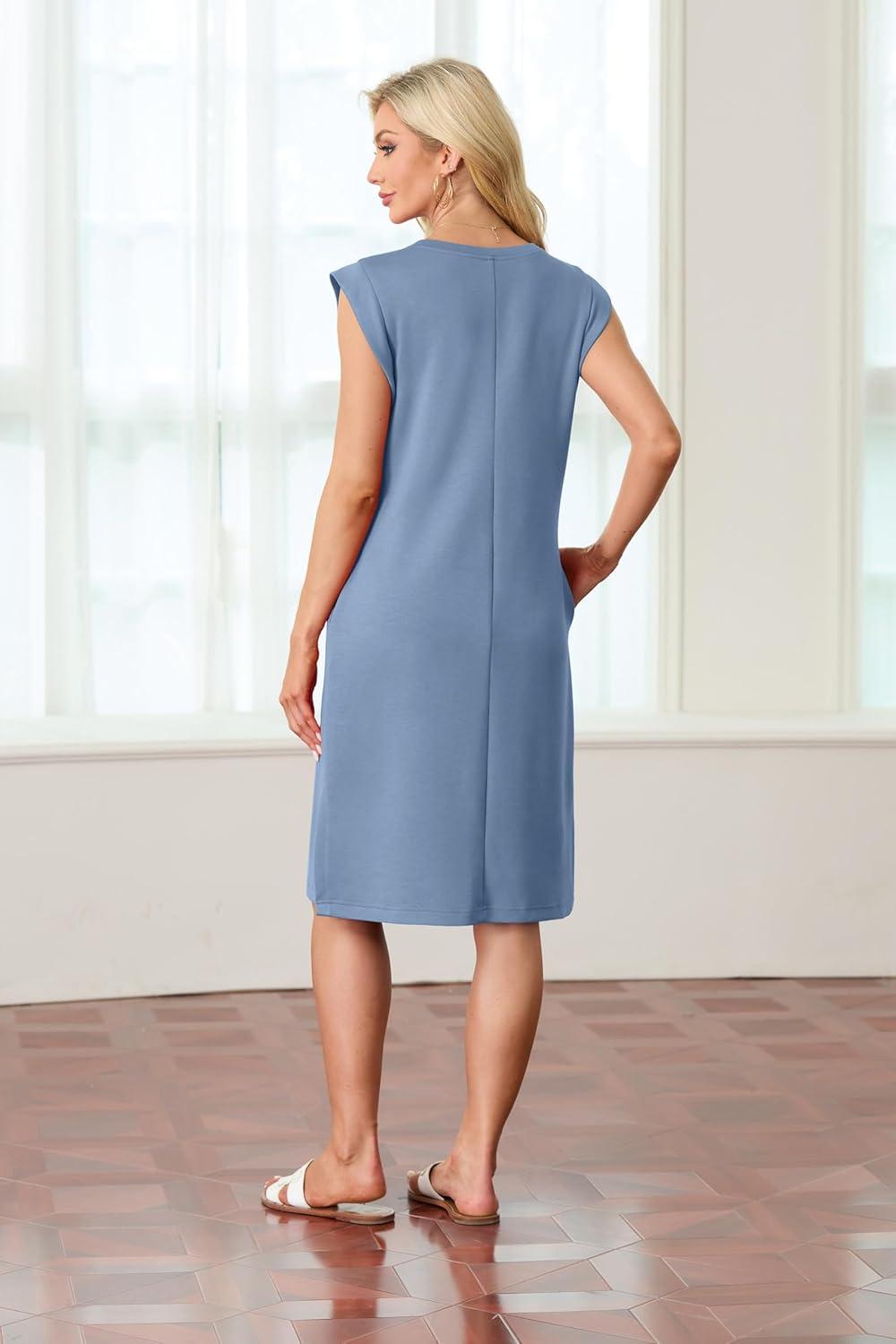 GRECERELLE 2025 Women Summer Round Neck Casual Loose Split Wrinkle-Free Midi Dress with Pockets (XS-3XL)(Denim Blue)