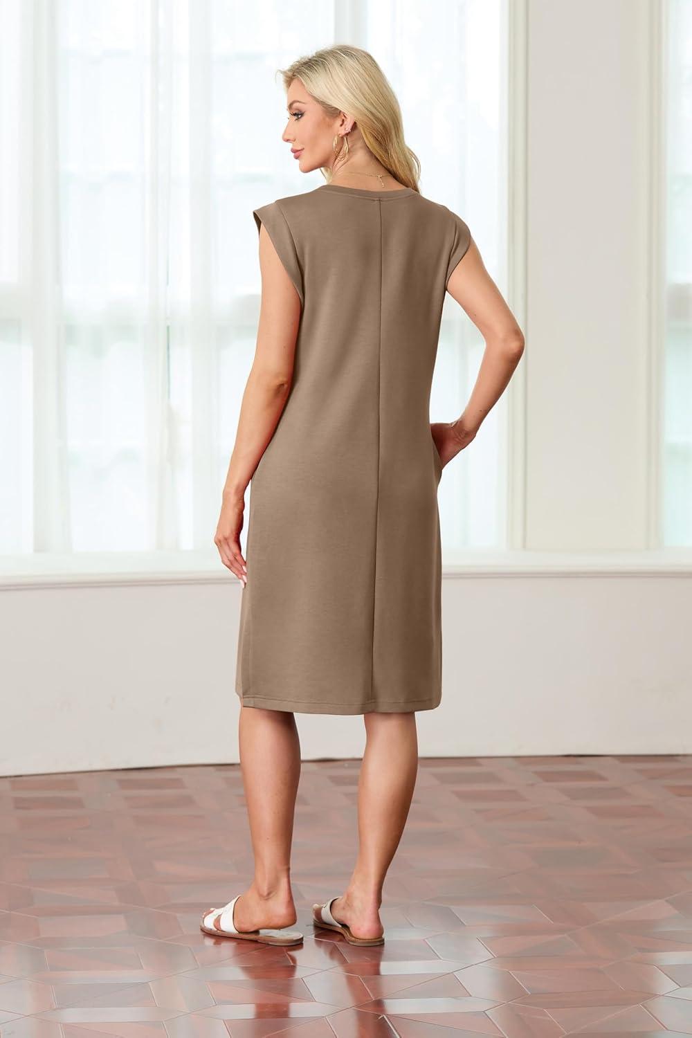 GRECERELLE 2025 Women Summer Round Neck Casual Loose Split Wrinkle-Free Midi Dress with Pockets (XS-3XL)(Light Coffee)