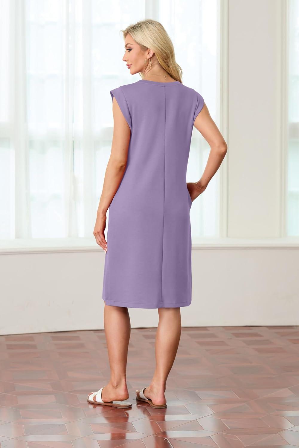 GRECERELLE 2025 Women Summer Round Neck Casual Loose Split Wrinkle-Free Midi Dress with Pockets (XS-3XL)(Lilac)
