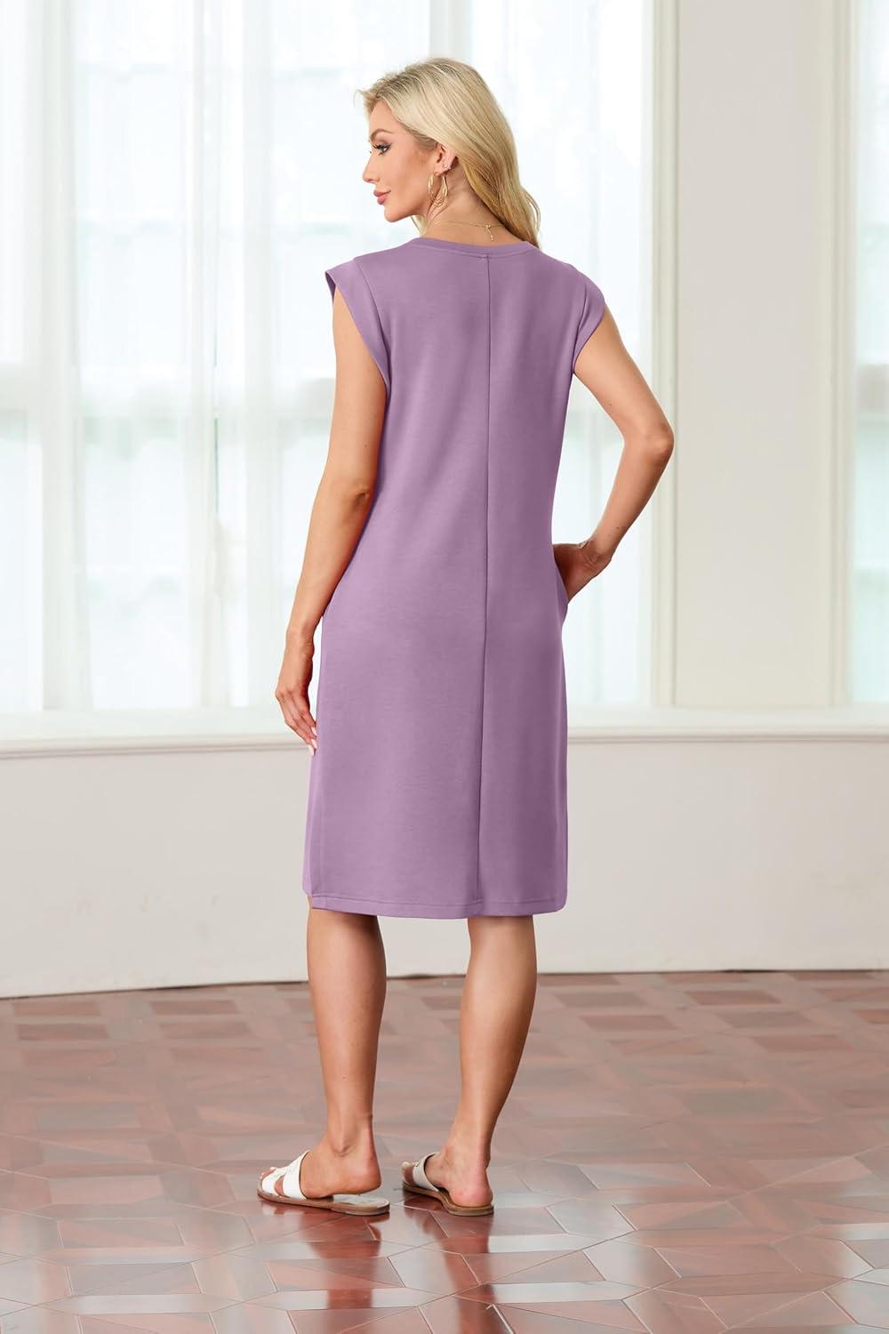 GRECERELLE 2025 Women Summer Round Neck Casual Loose Split Wrinkle-Free Midi Dress with Pockets (XS-3XL)(Lilac)