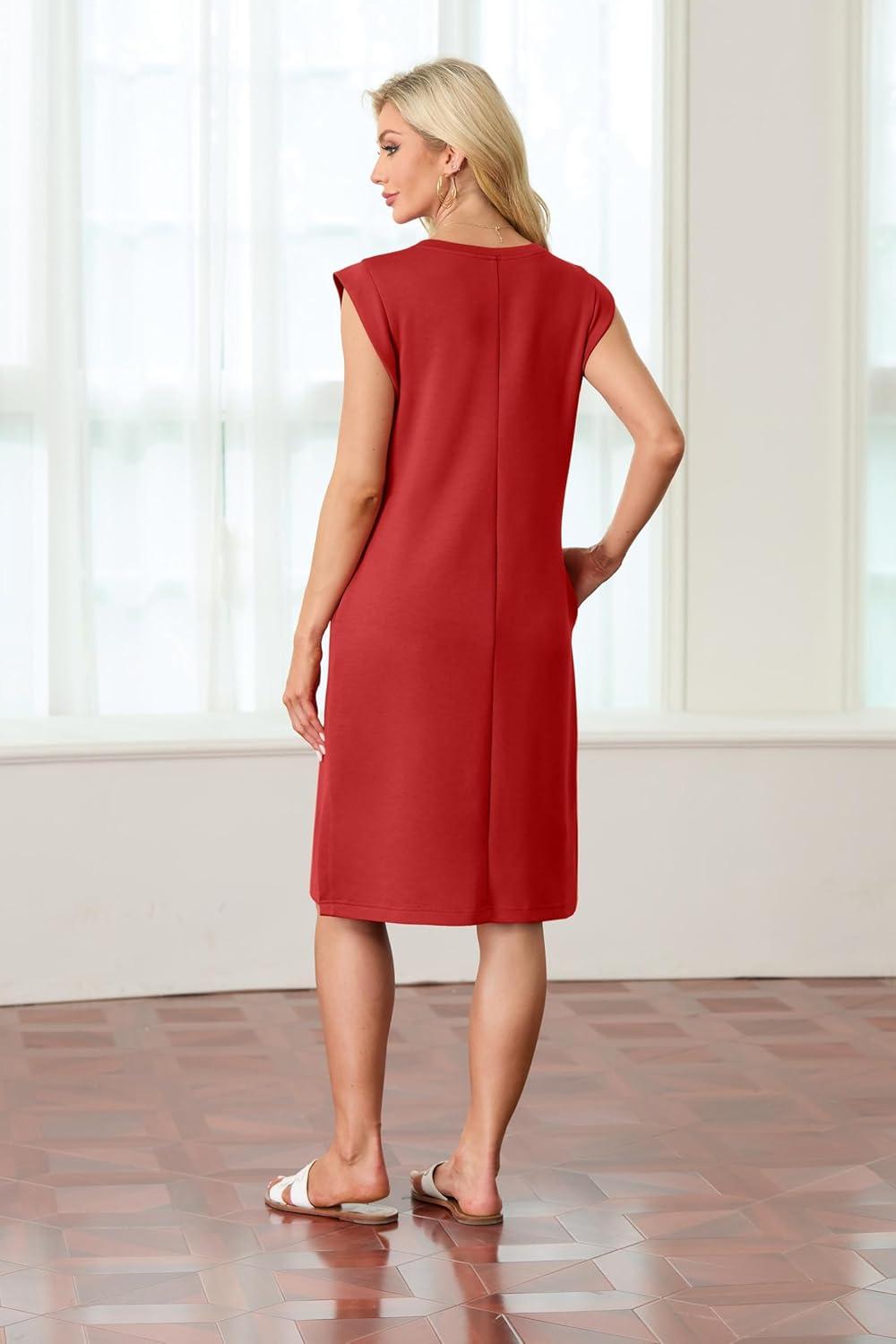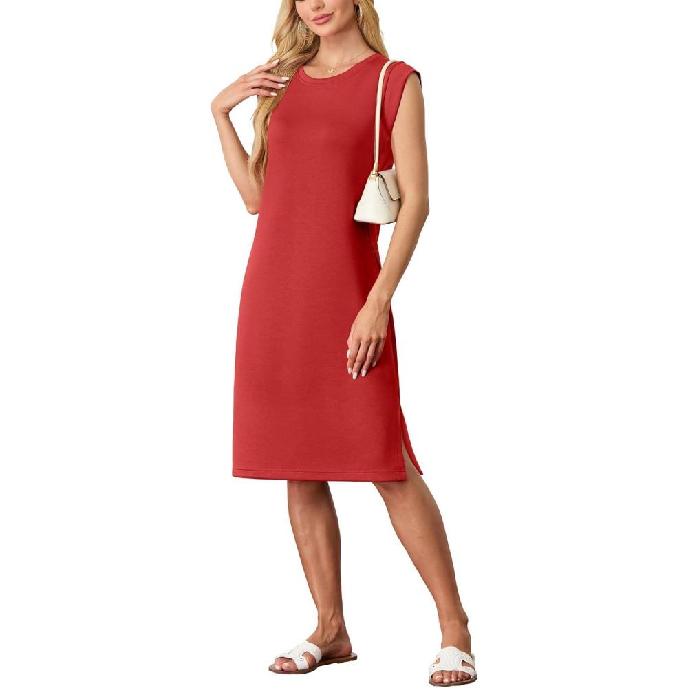 GRECERELLE 2025 Women Summer Round Neck Casual Loose Split Wrinkle-Free Midi Dress with Pockets (XS-3XL)(Red)