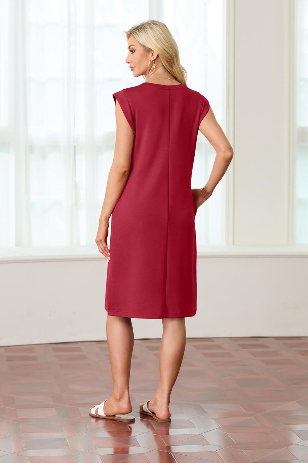 GRECERELLE 2025 Women Summer Round Neck Casual Loose Split Wrinkle-Free Midi Dress with Pockets (XS-3XL)(Wine Red)