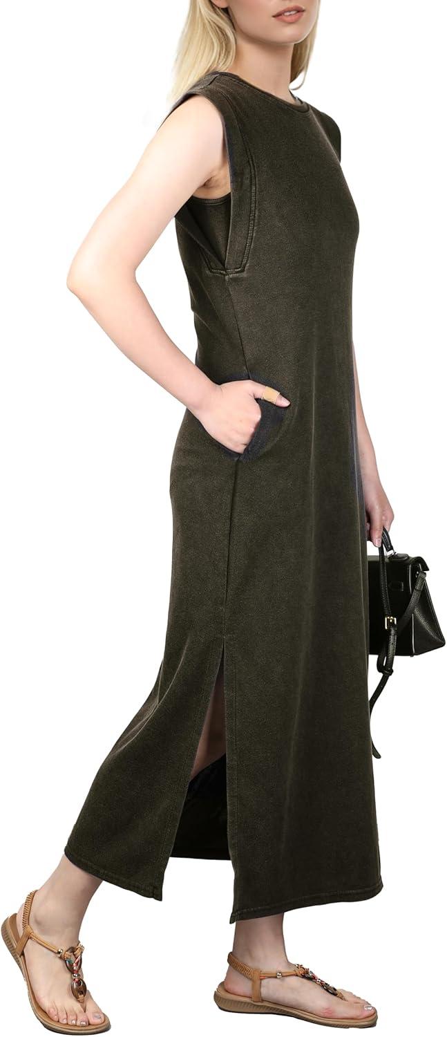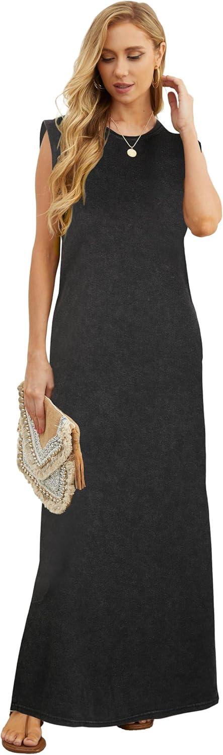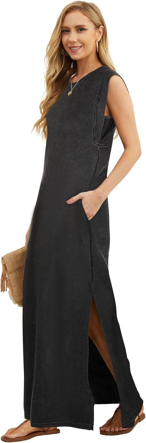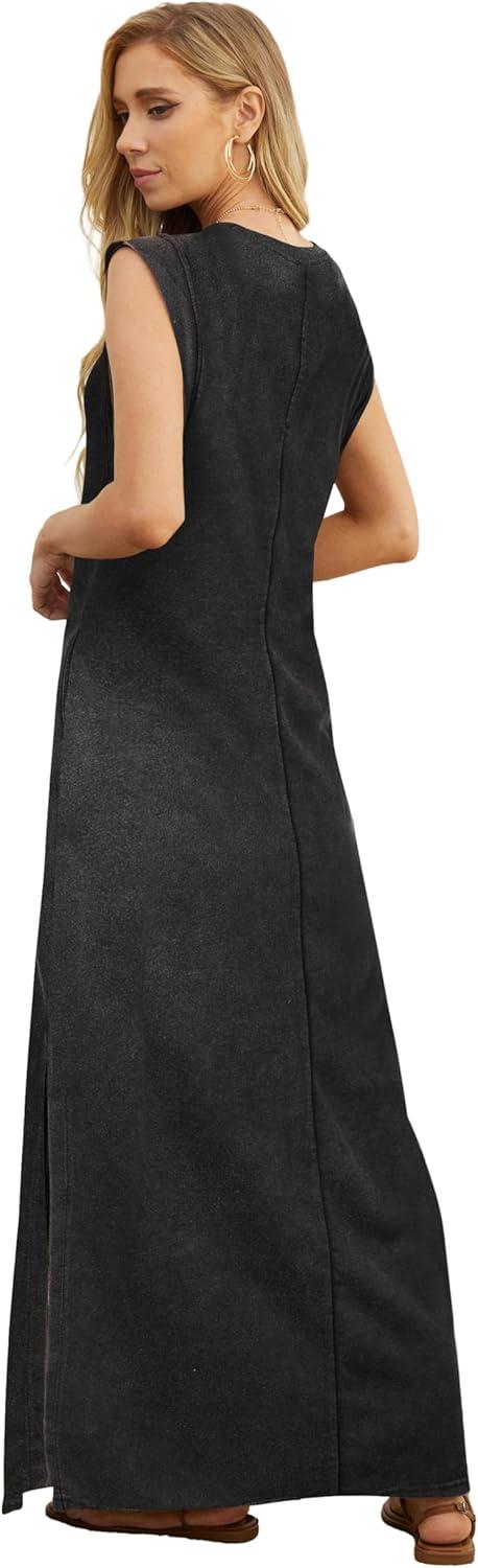 GRECERELLE 2025 Women Year-Round Casual Round Neck Loose Split Wrinkle-Free Long Maxi Vacation Dress with Pockets (XS-3XL)(Acid Washed Black)