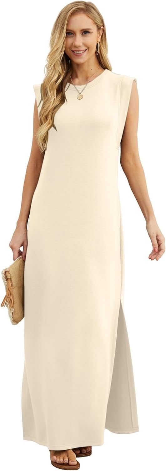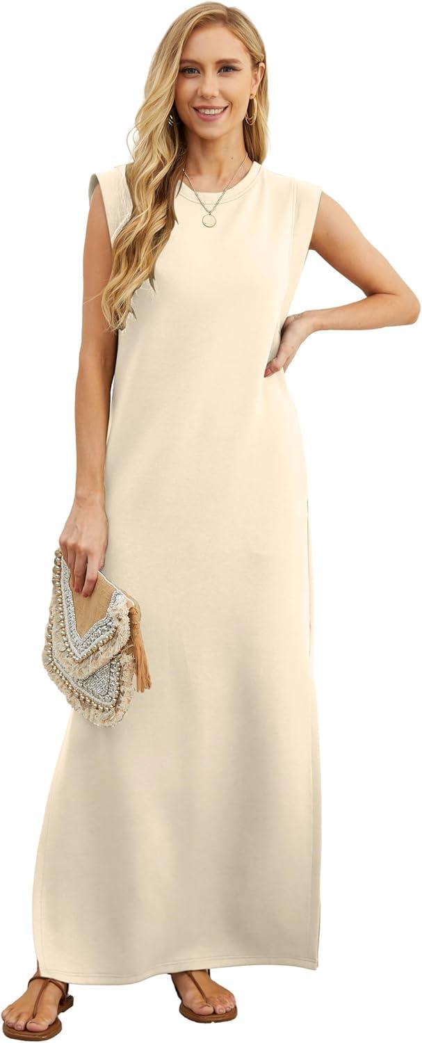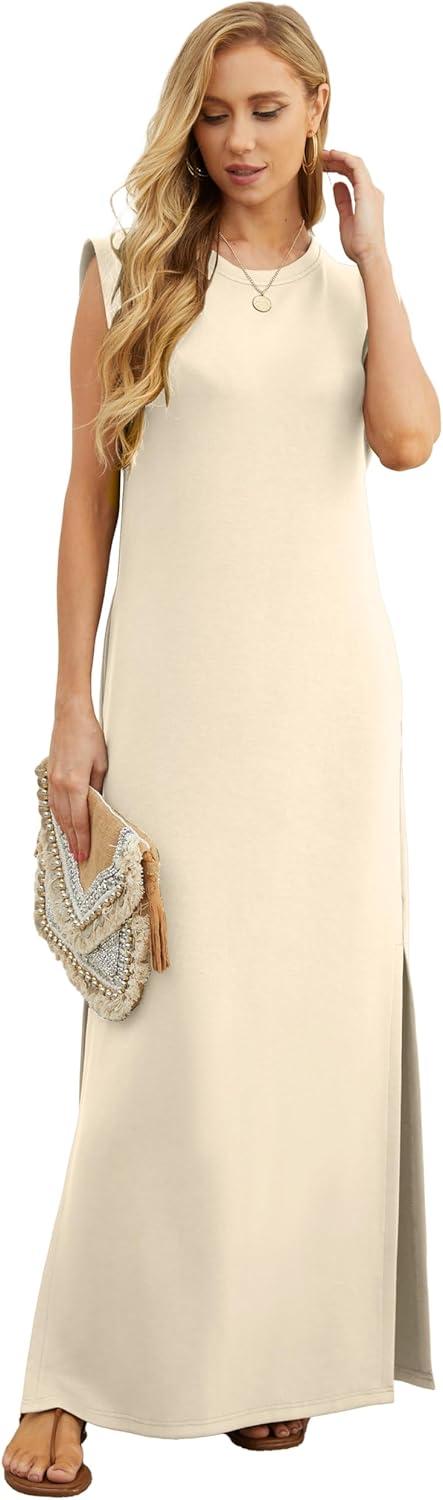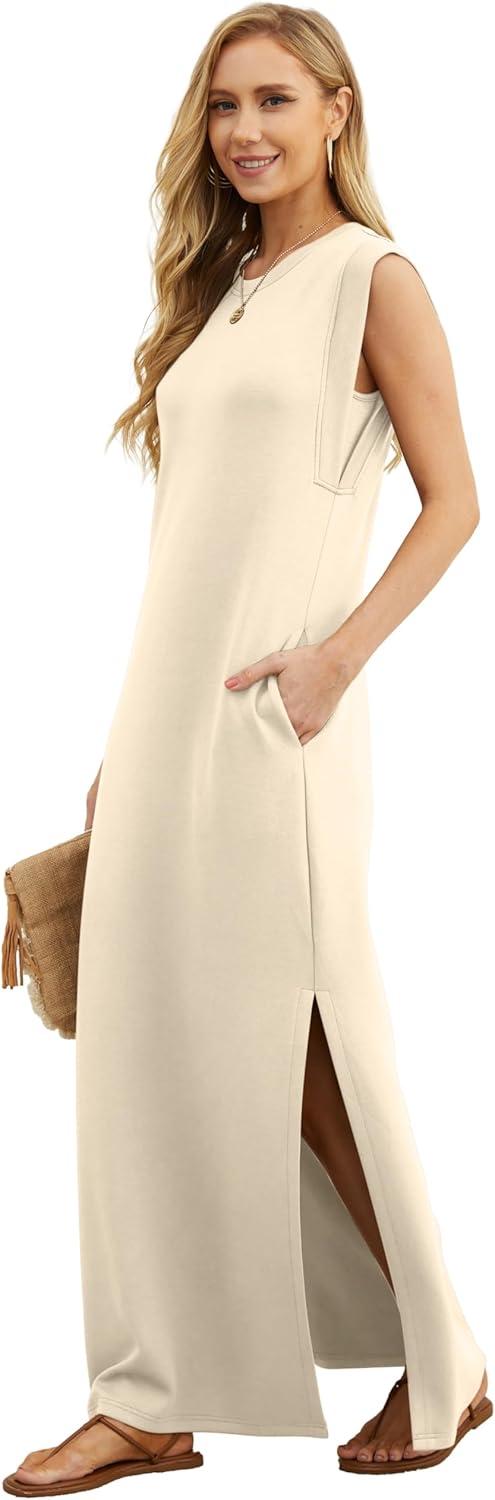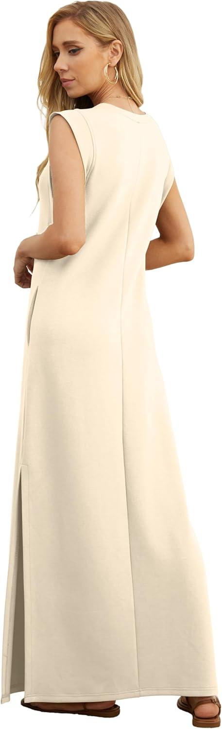 GRECERELLE 2025 Women Year-Round Casual Round Neck Loose Split Wrinkle-Free Long Maxi Vacation Dress with Pockets (XS-3XL)(Apricot White)
