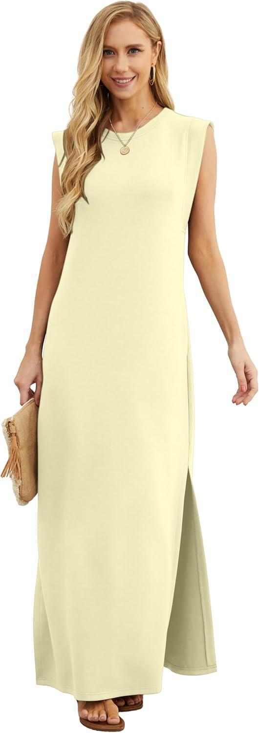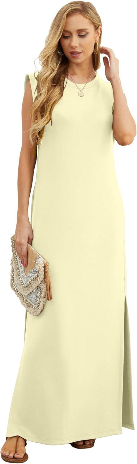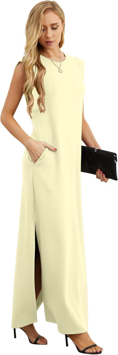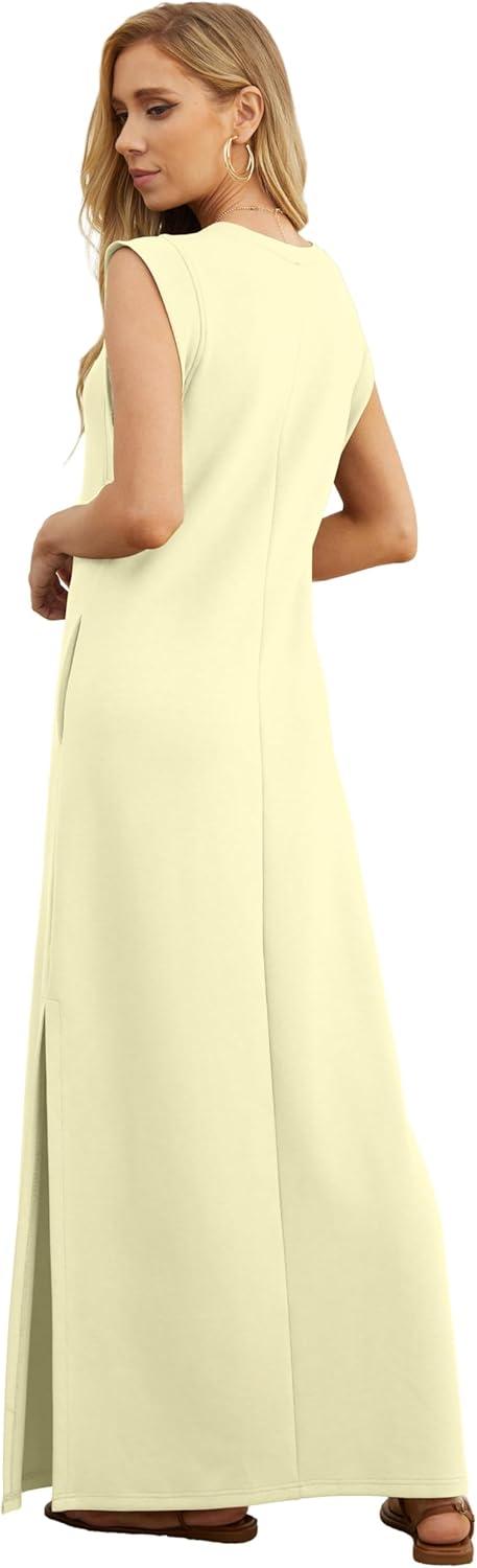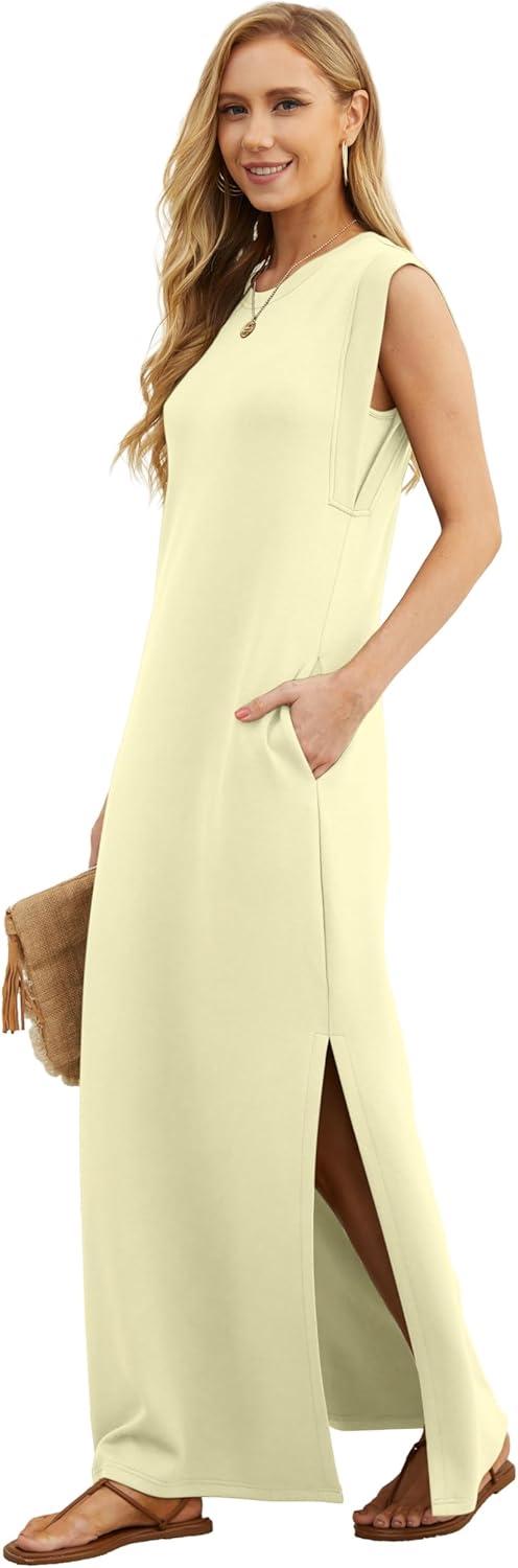 GRECERELLE 2025 Women Year-Round Casual Round Neck Loose Split Wrinkle-Free Long Maxi Vacation Dress with Pockets (XS-3XL)(Apricot)