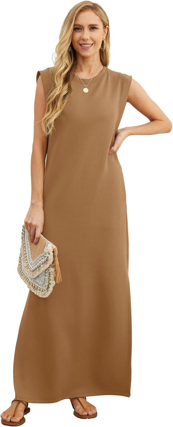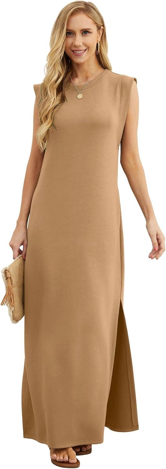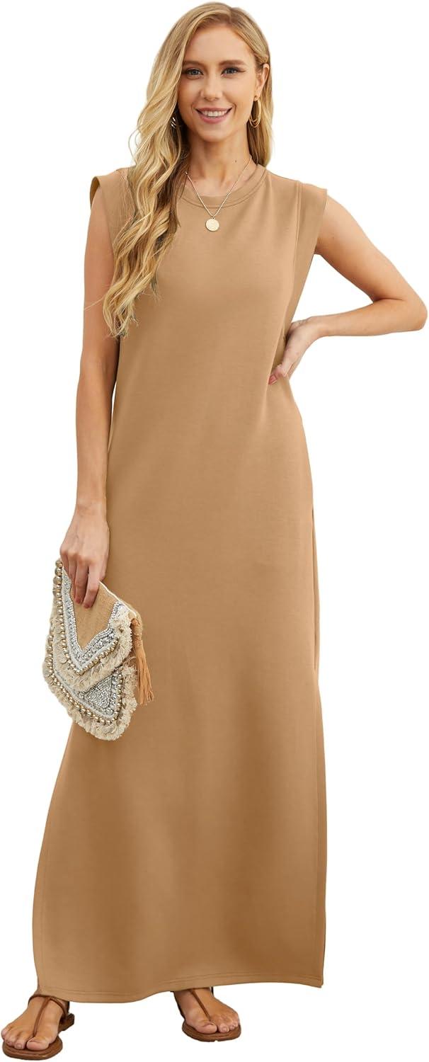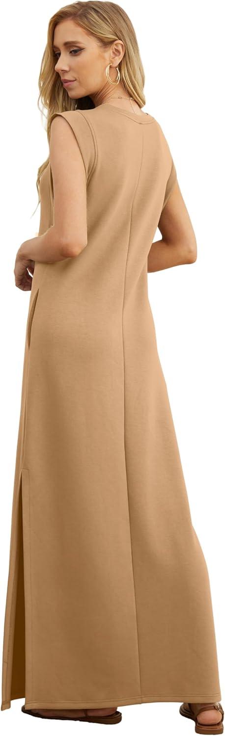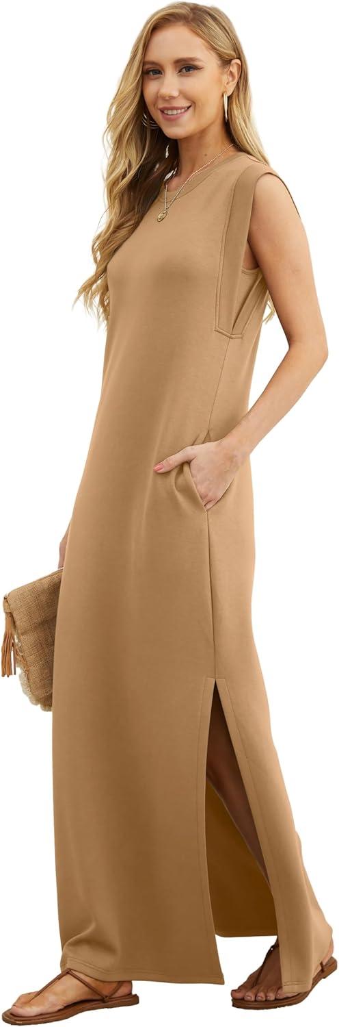 GRECERELLE 2025 Women Year-Round Casual Round Neck Loose Split Wrinkle-Free Long Maxi Vacation Dress with Pockets (XS-3XL)(Camel)