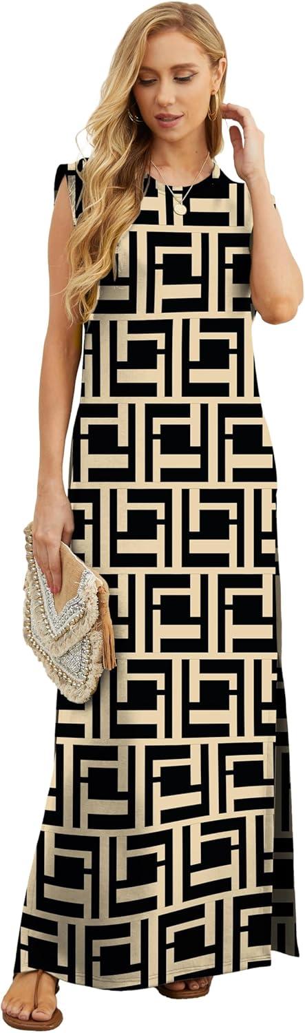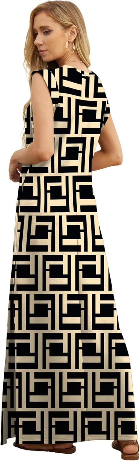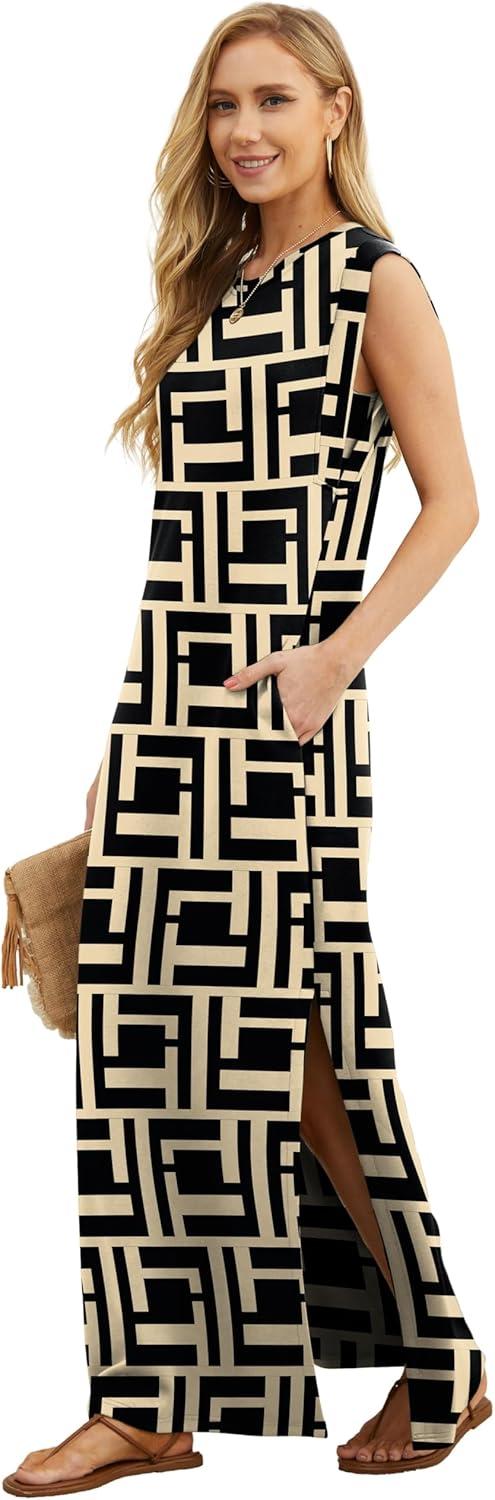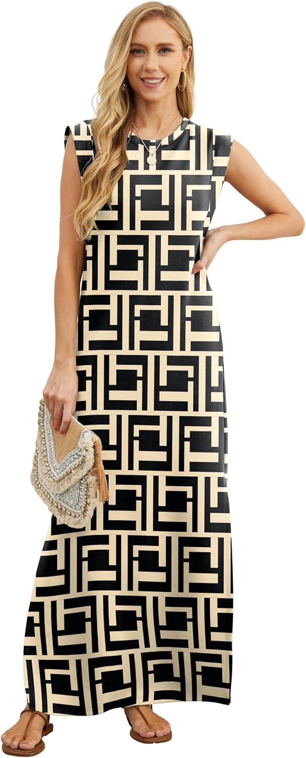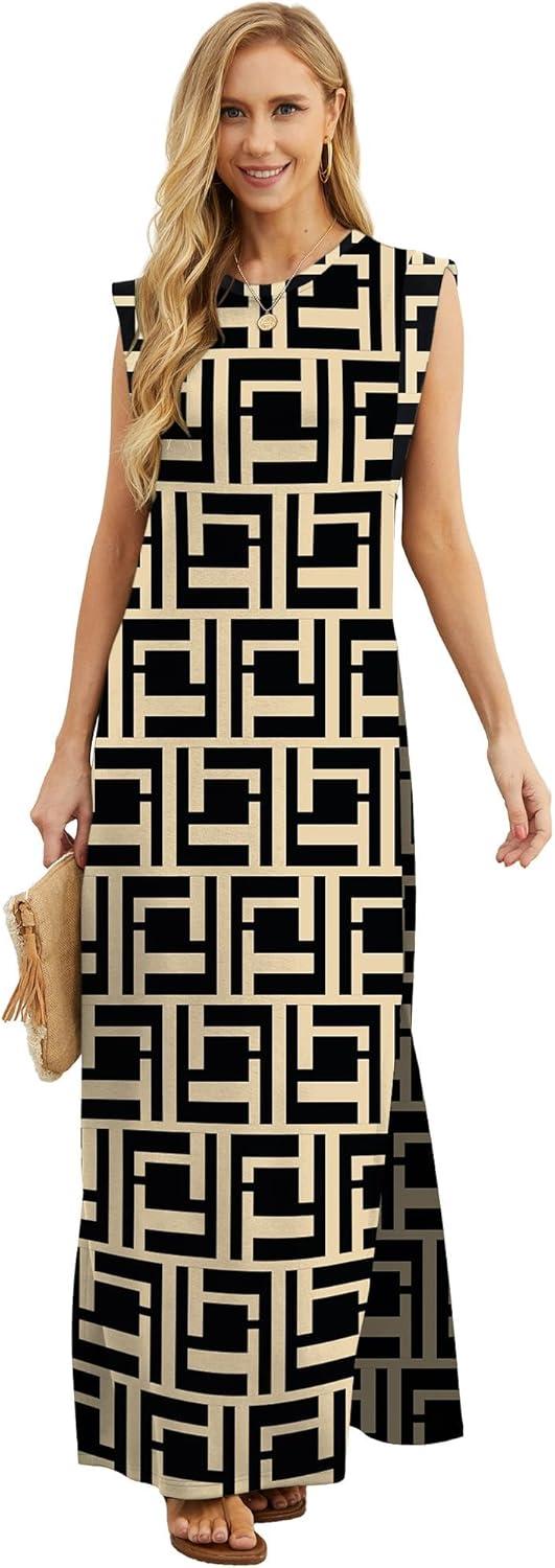 GRECERELLE 2025 Women Year-Round Casual Round Neck Loose Split Wrinkle-Free Long Maxi Vacation Dress with Pockets (XS-3XL)(Fp Black Puzzle)
