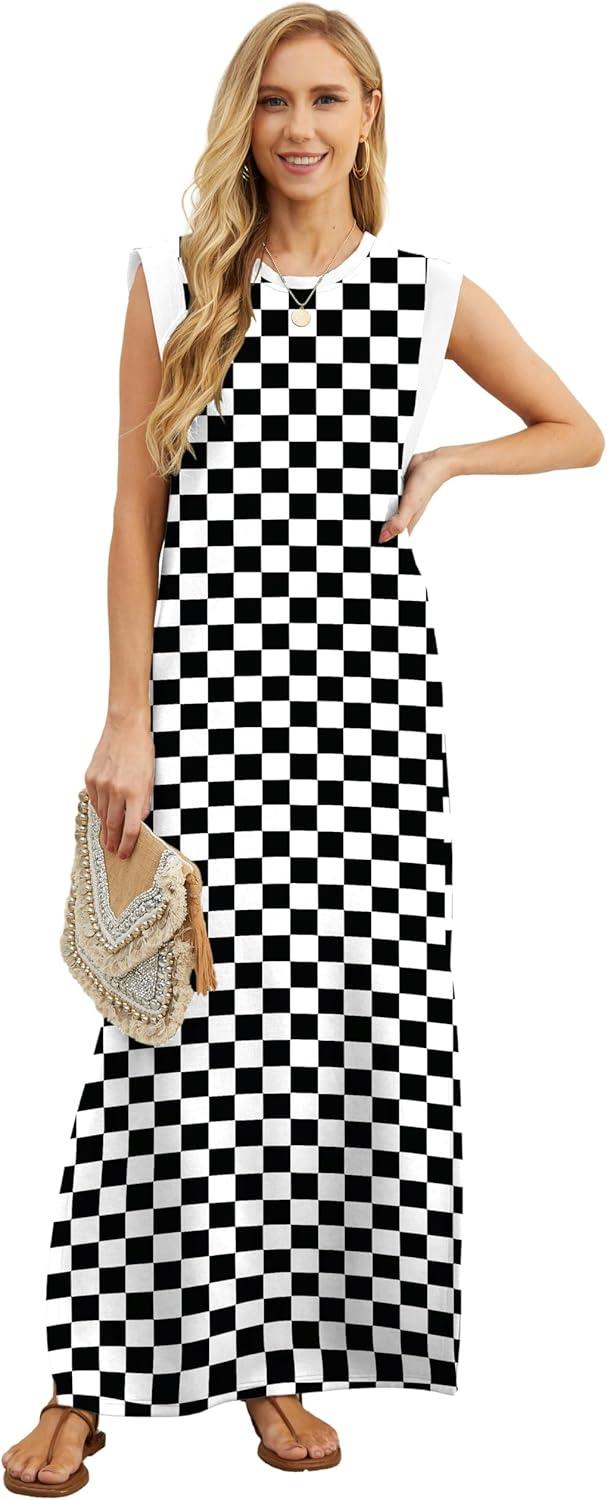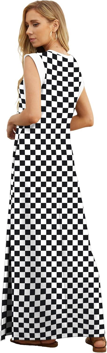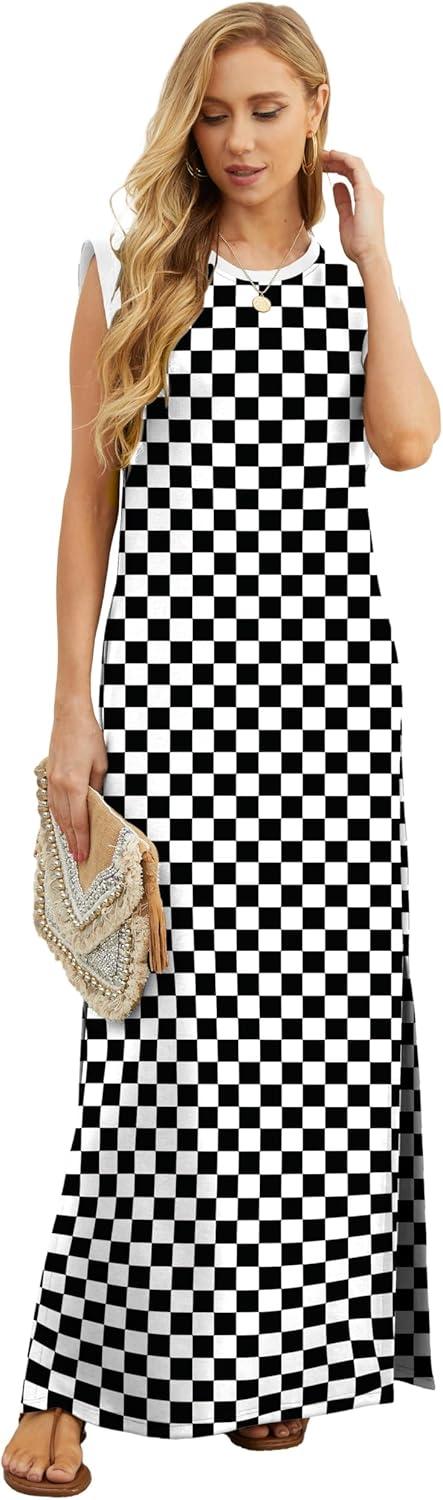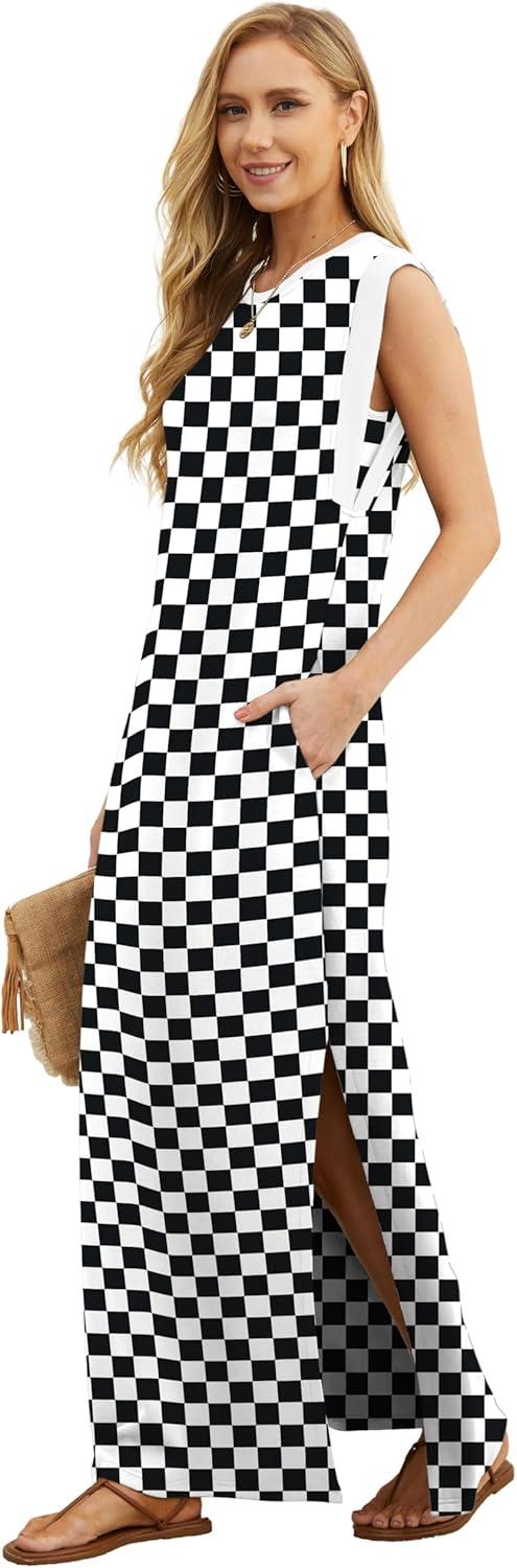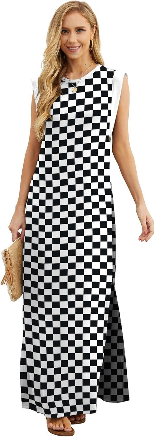 GRECERELLE 2025 Women Year-Round Casual Round Neck Loose Split Wrinkle-Free Long Maxi Vacation Dress with Pockets (XS-3XL)(Fp Checkered)