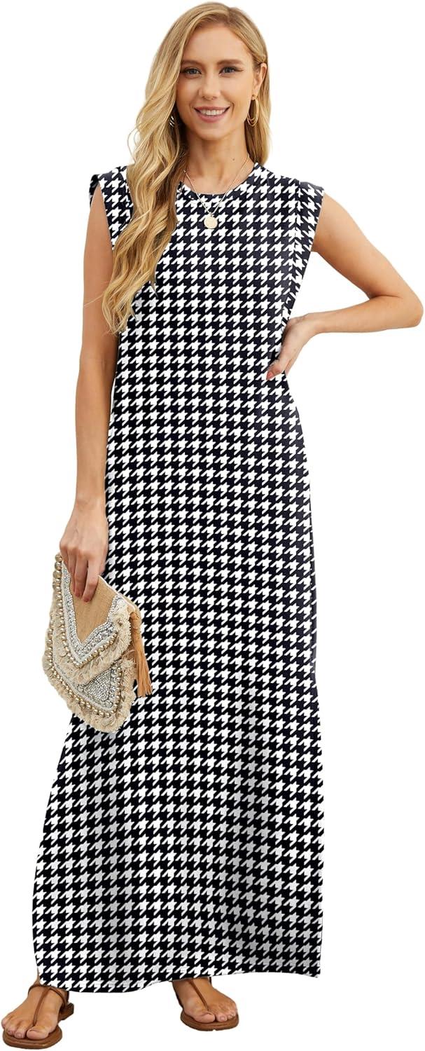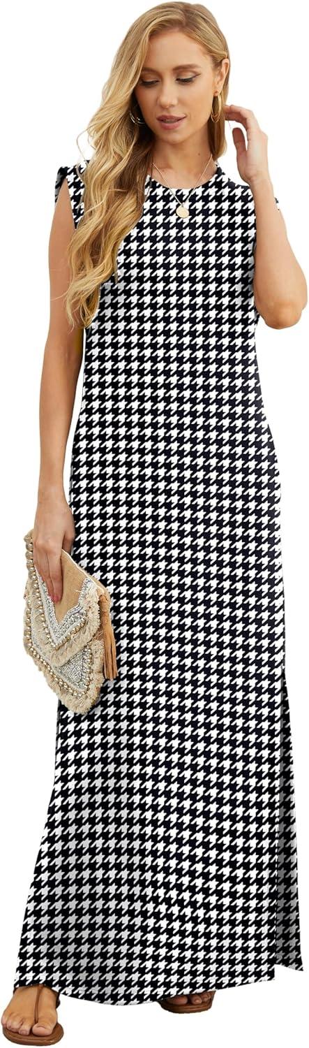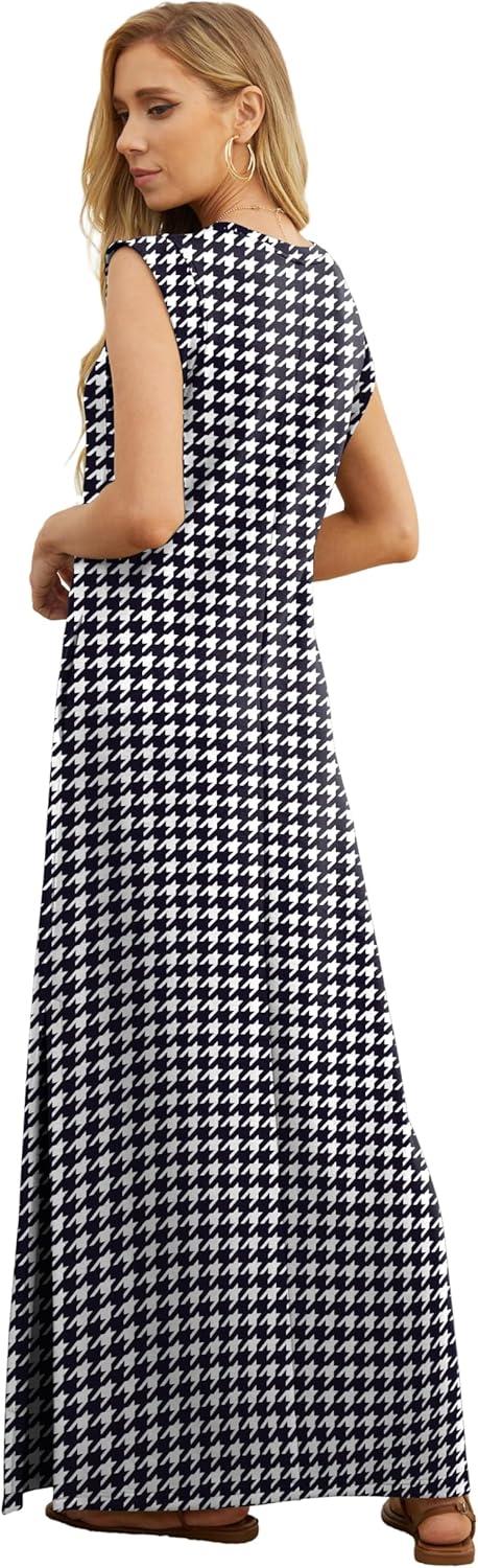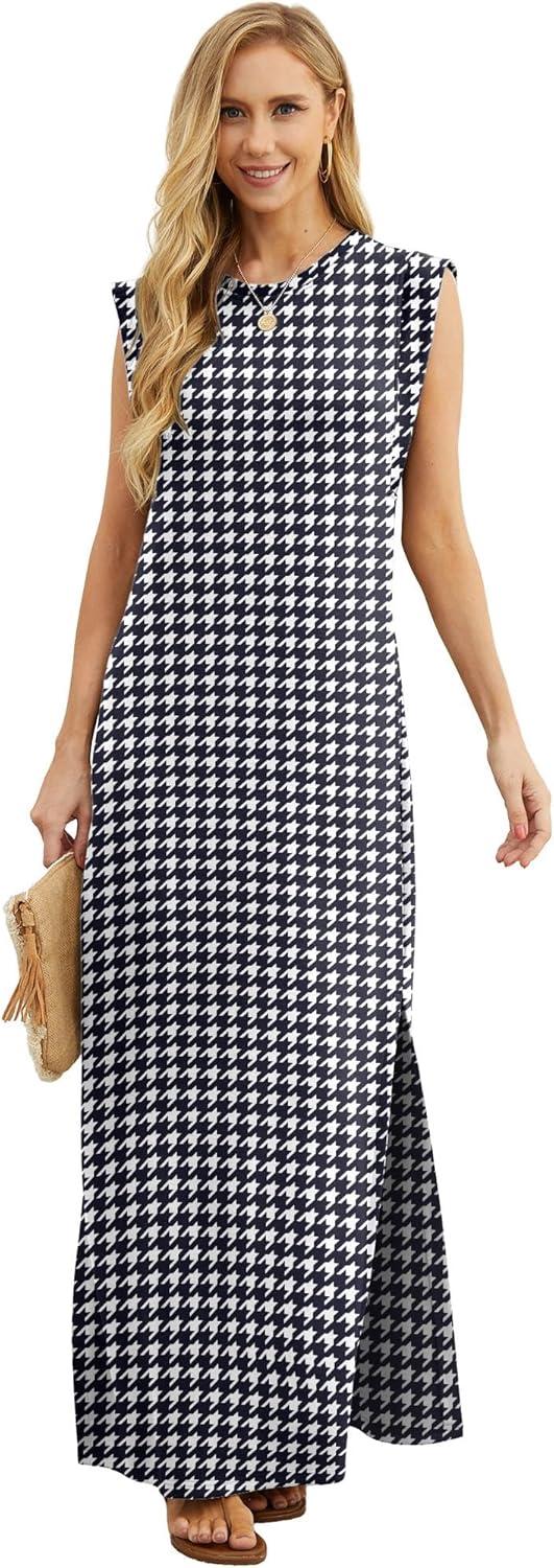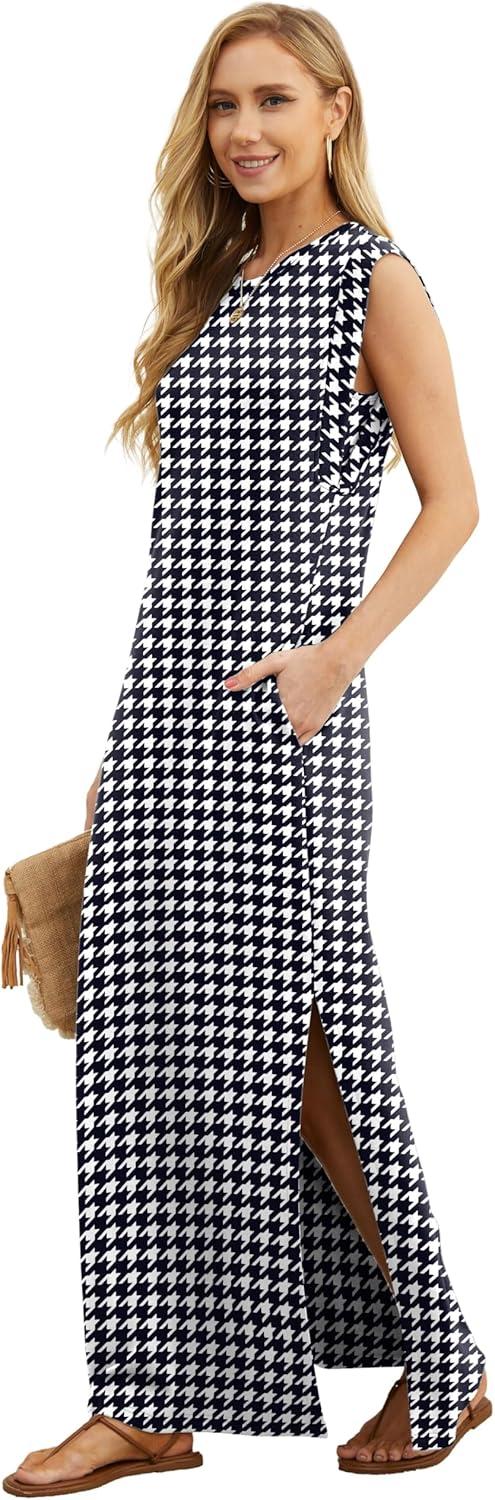 GRECERELLE 2025 Women Year-Round Casual Round Neck Loose Split Wrinkle-Free Long Maxi Vacation Dress with Pockets (XS-3XL)(Fp Houndstooth)