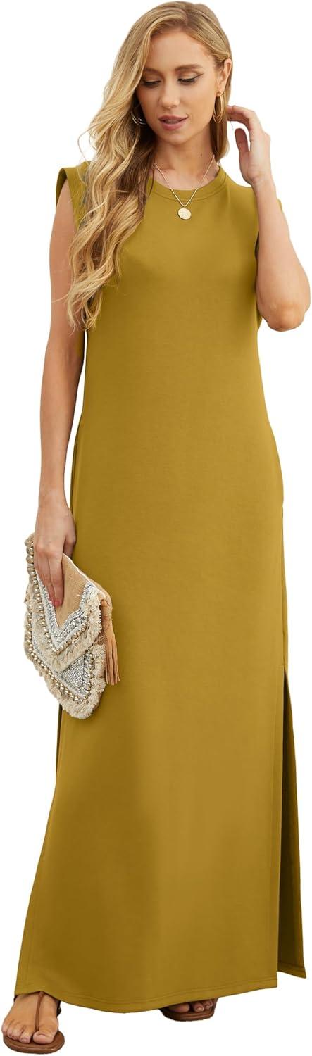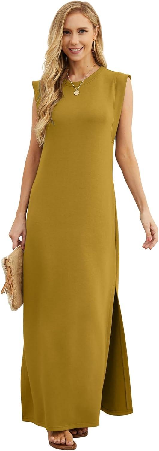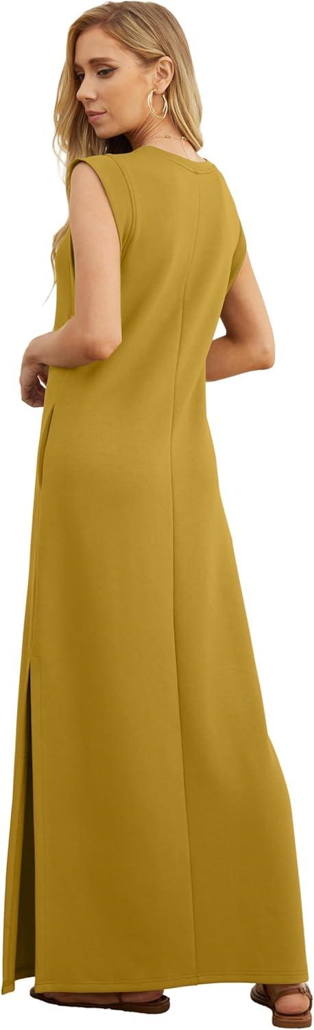 GRECERELLE 2025 Women Year-Round Casual Round Neck Loose Split Wrinkle-Free Long Maxi Vacation Dress with Pockets (XS-3XL)(Ginger)