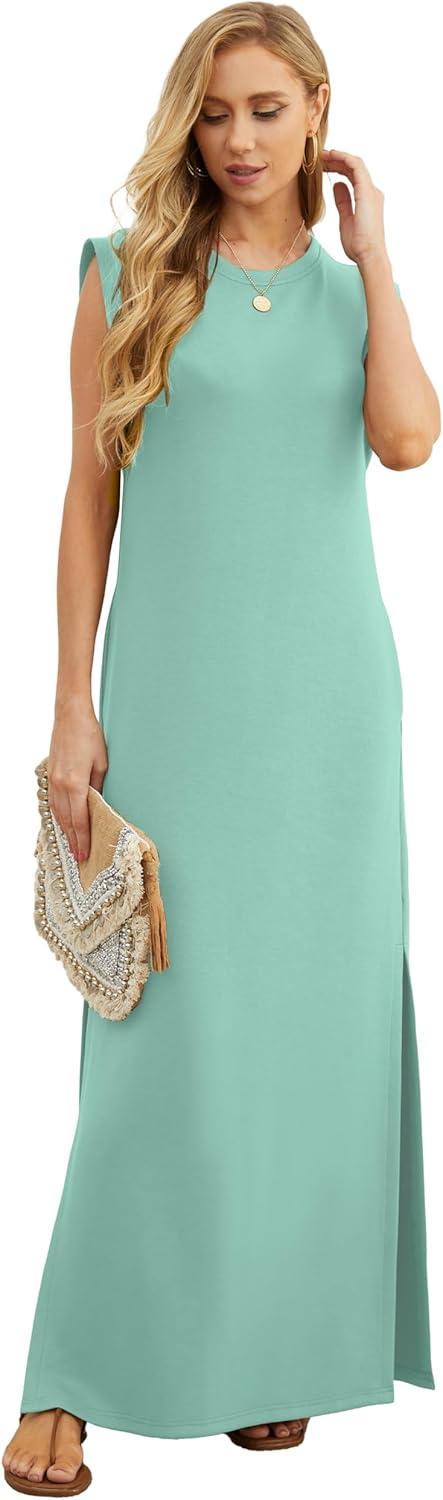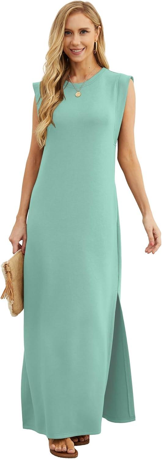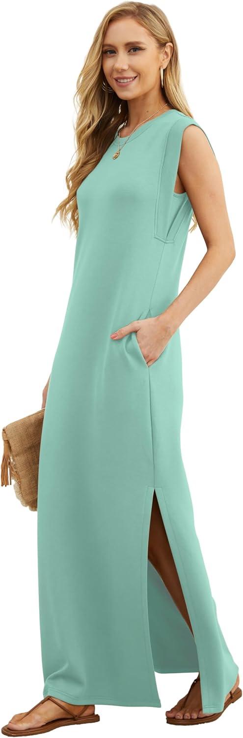 GRECERELLE 2025 Women Year-Round Casual Round Neck Loose Split Wrinkle-Free Long Maxi Vacation Dress with Pockets (XS-3XL)(Light Blue)