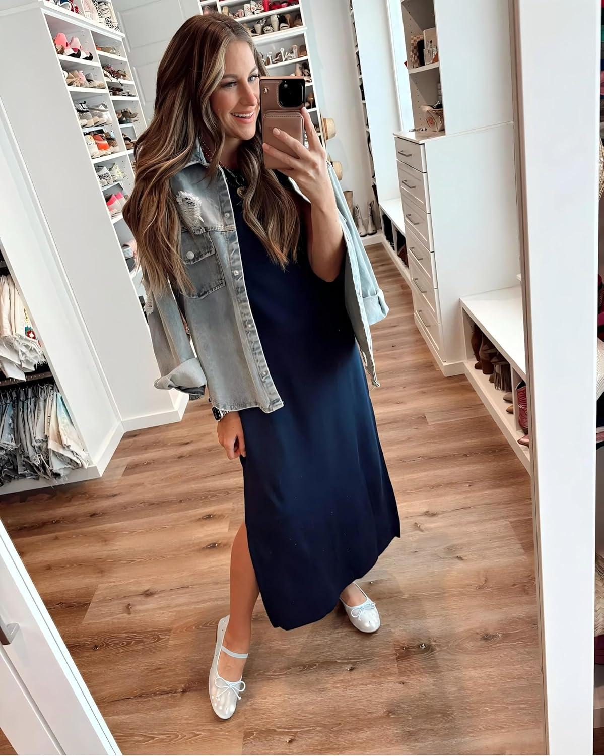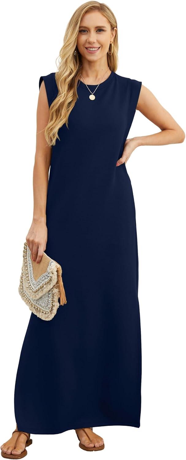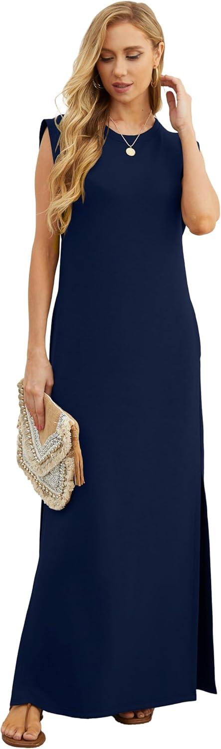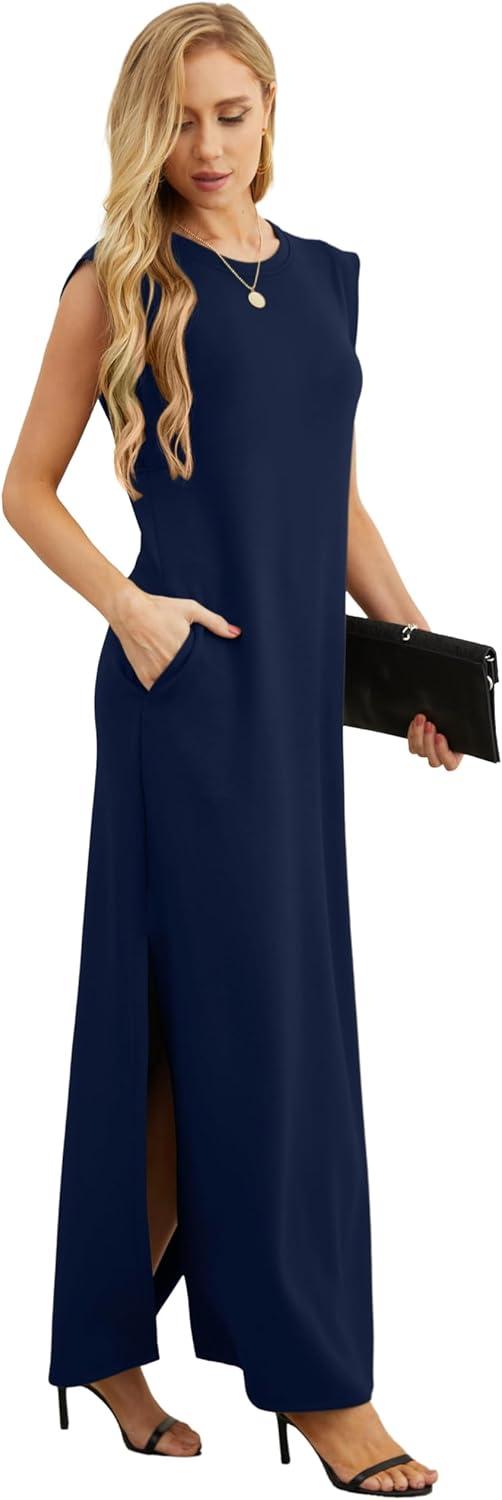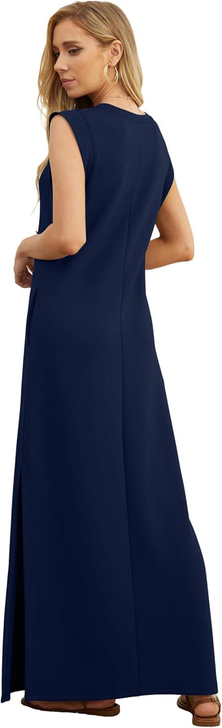 GRECERELLE 2025 Women Year-Round Casual Round Neck Loose Split Wrinkle-Free Long Maxi Vacation Dress with Pockets (XS-3XL)(Navy Blue)