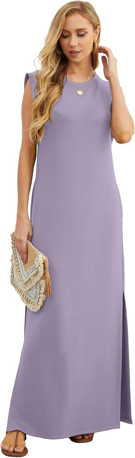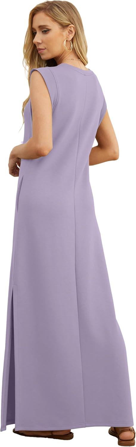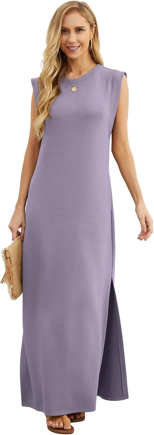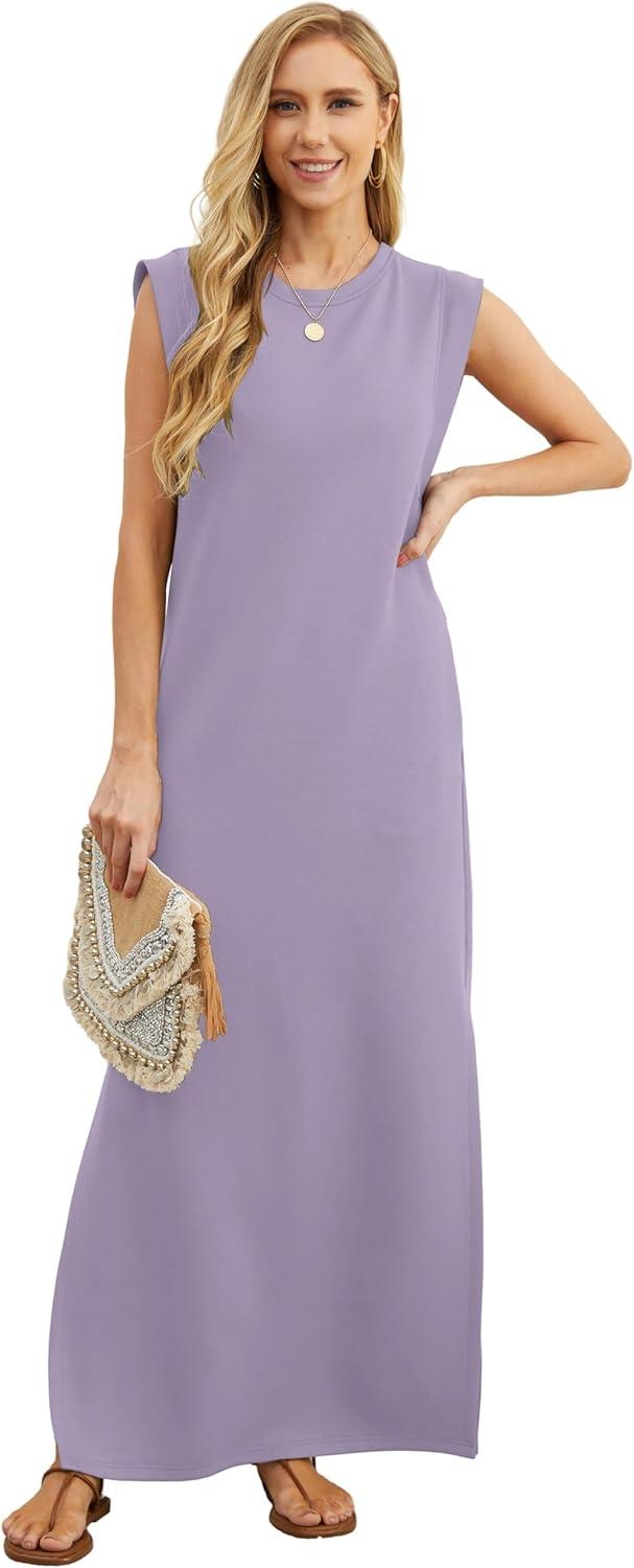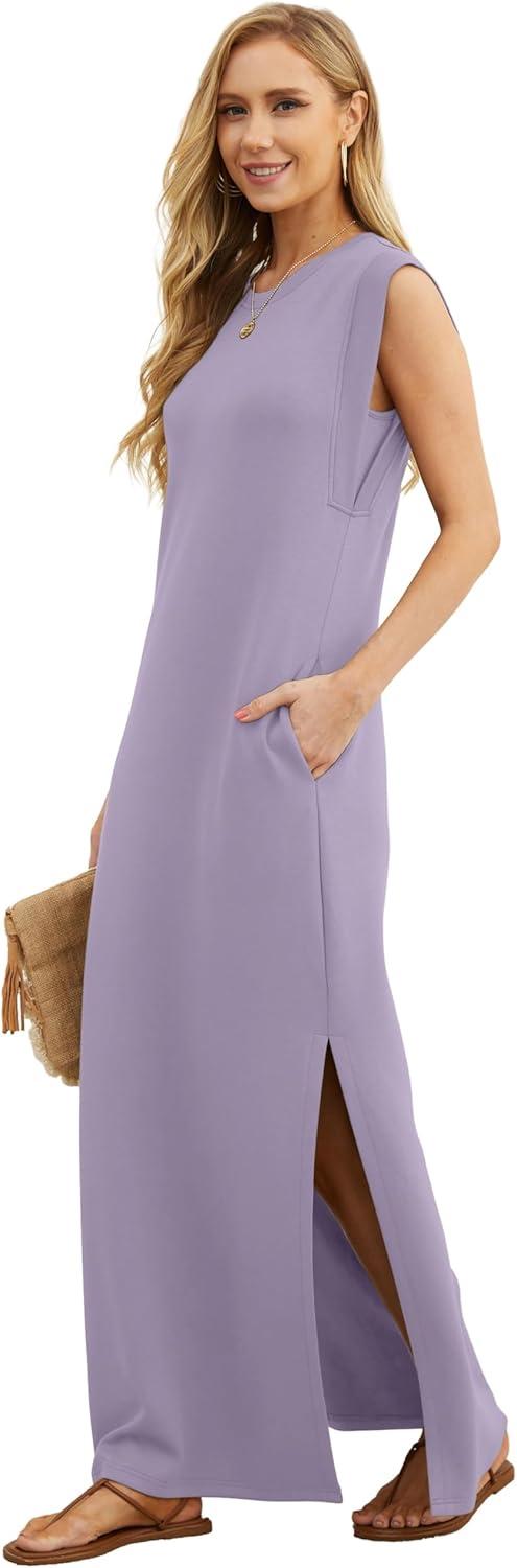 GRECERELLE 2025 Women Year-Round Casual Round Neck Loose Split Wrinkle-Free Long Maxi Vacation Dress with Pockets (XS-3XL)(Purple)
