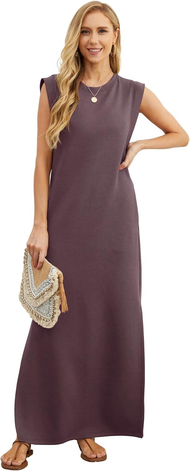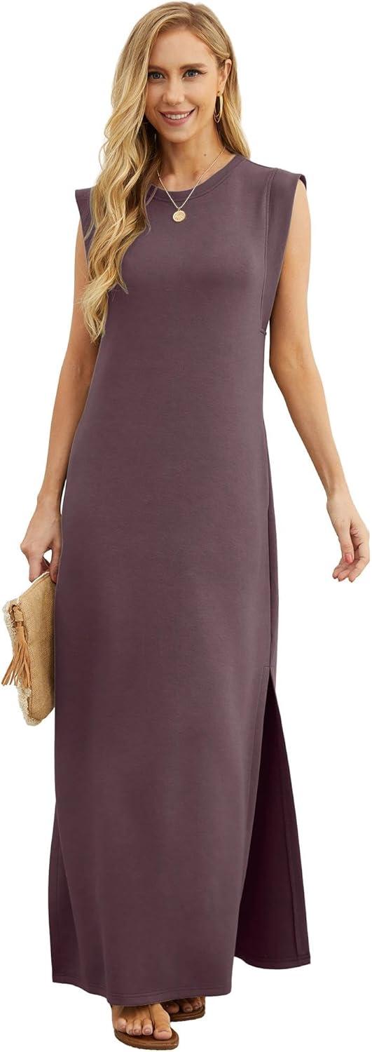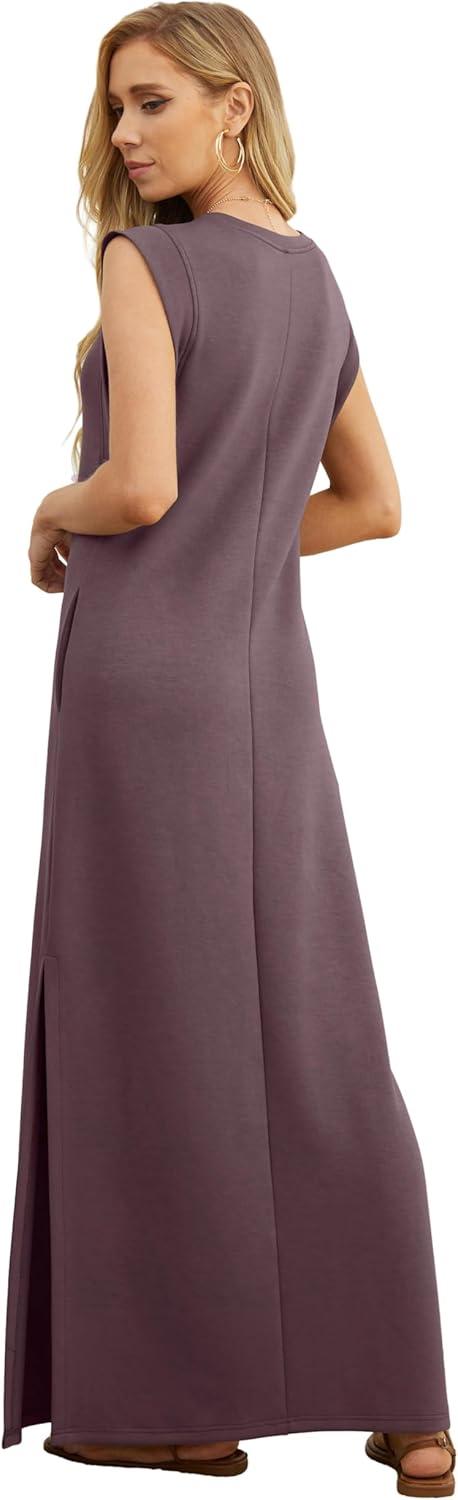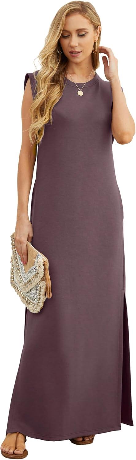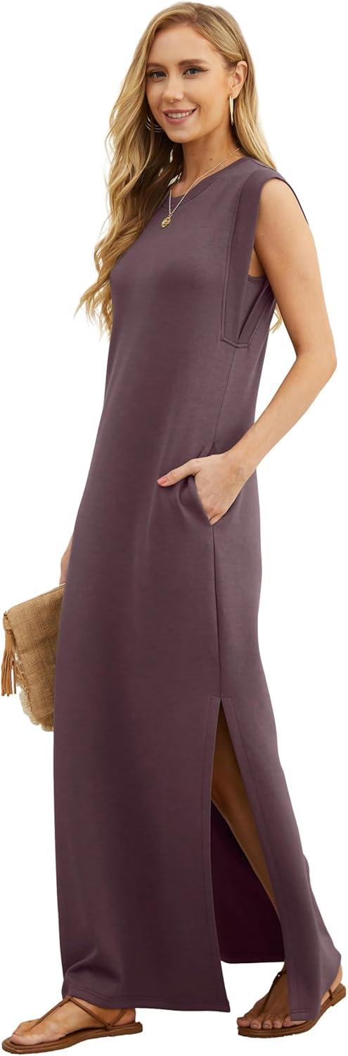 GRECERELLE 2025 Women Year-Round Casual Round Neck Loose Split Wrinkle-Free Long Maxi Vacation Dress with Pockets (XS-3XL)(Rosewood)