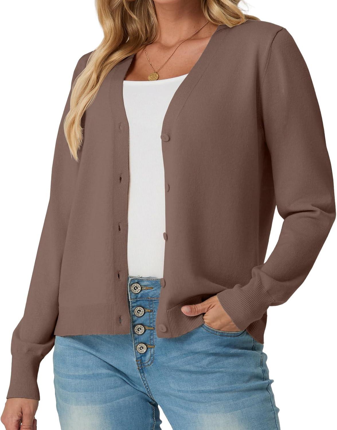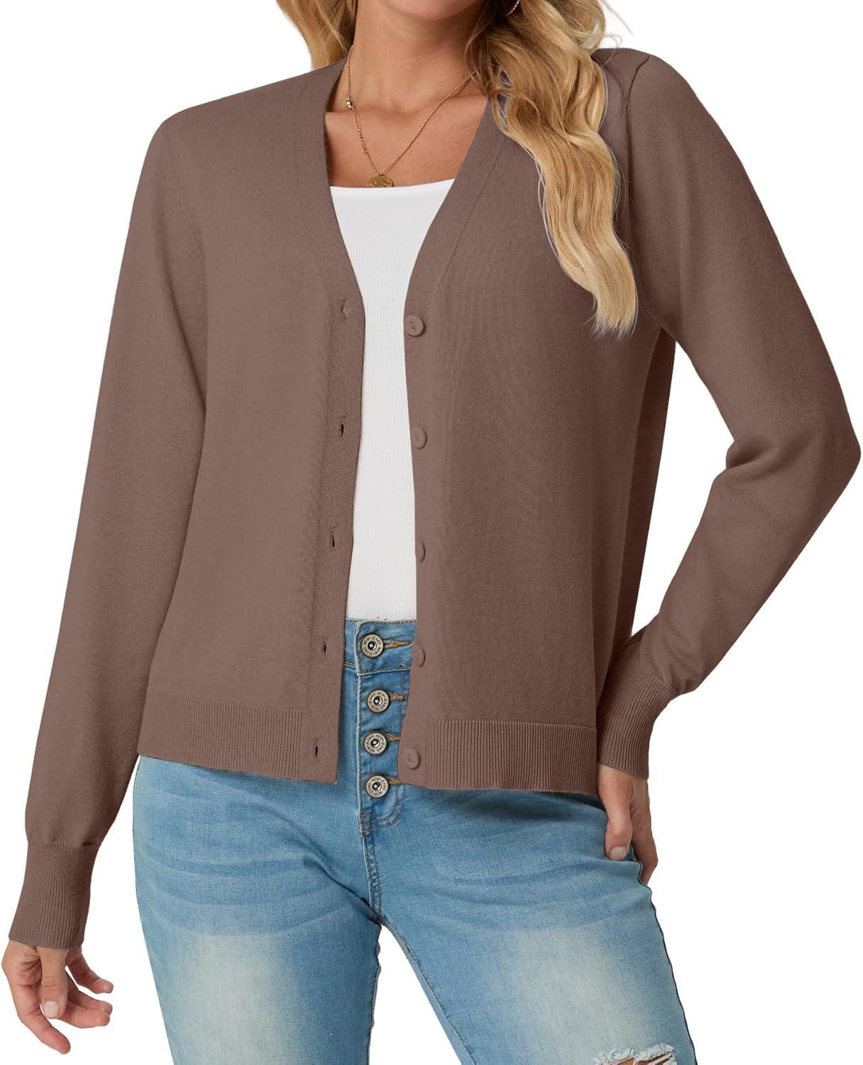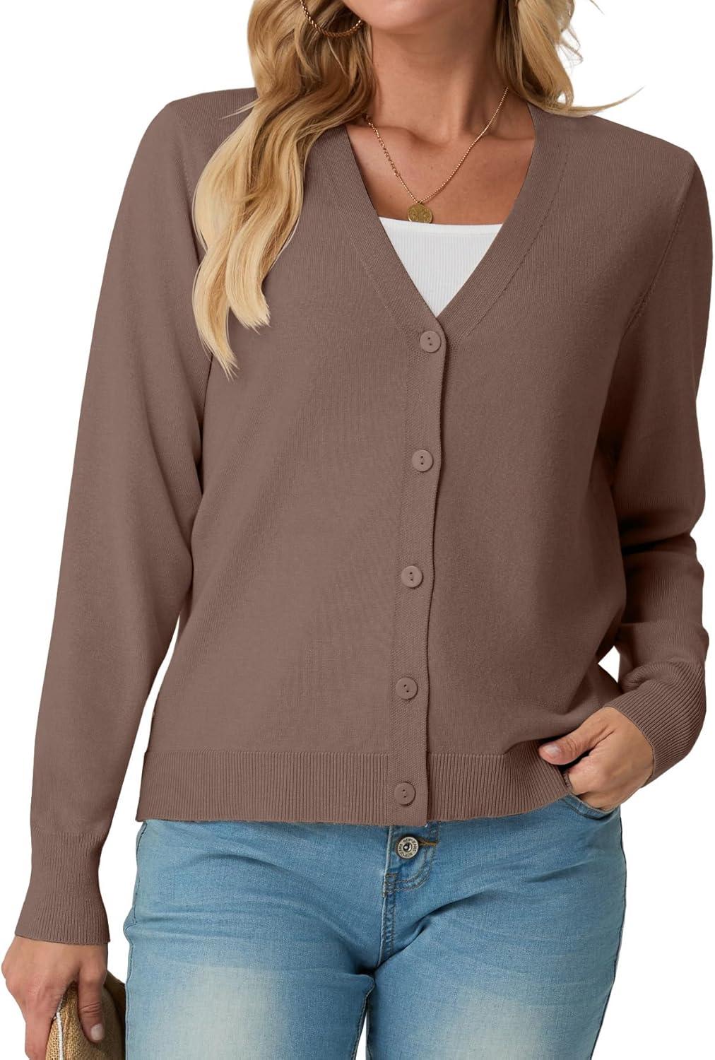 GRECERELLE 2025 Womens Lightweight Open Front Long Sleeve Casual Button Down V-Neck Cardigan Sweater (S-2XL)(Brown)