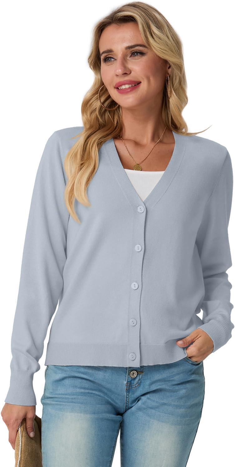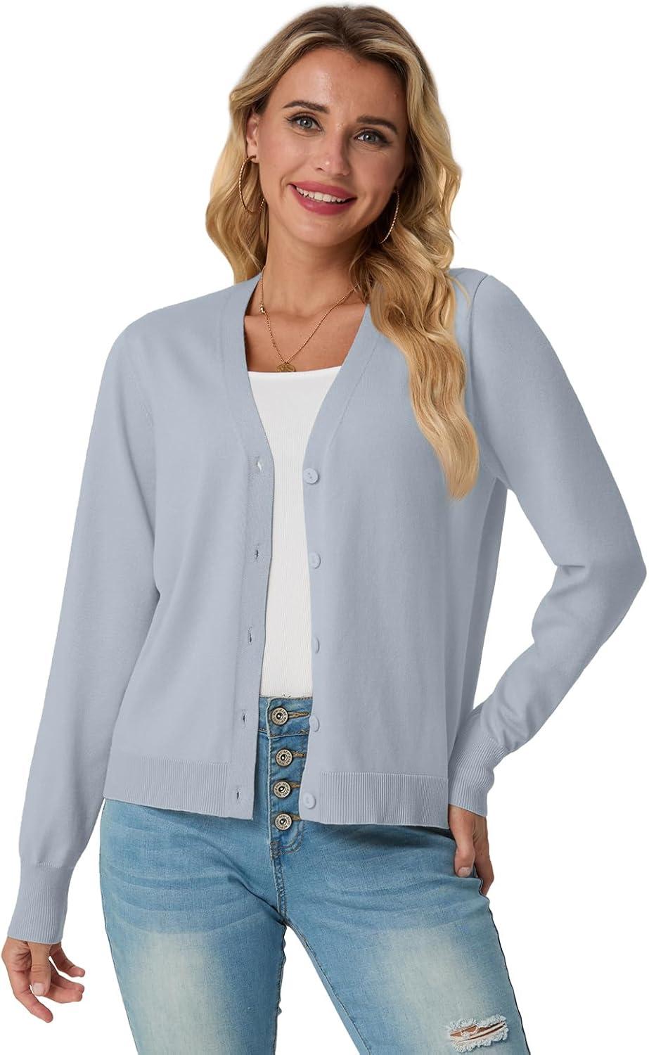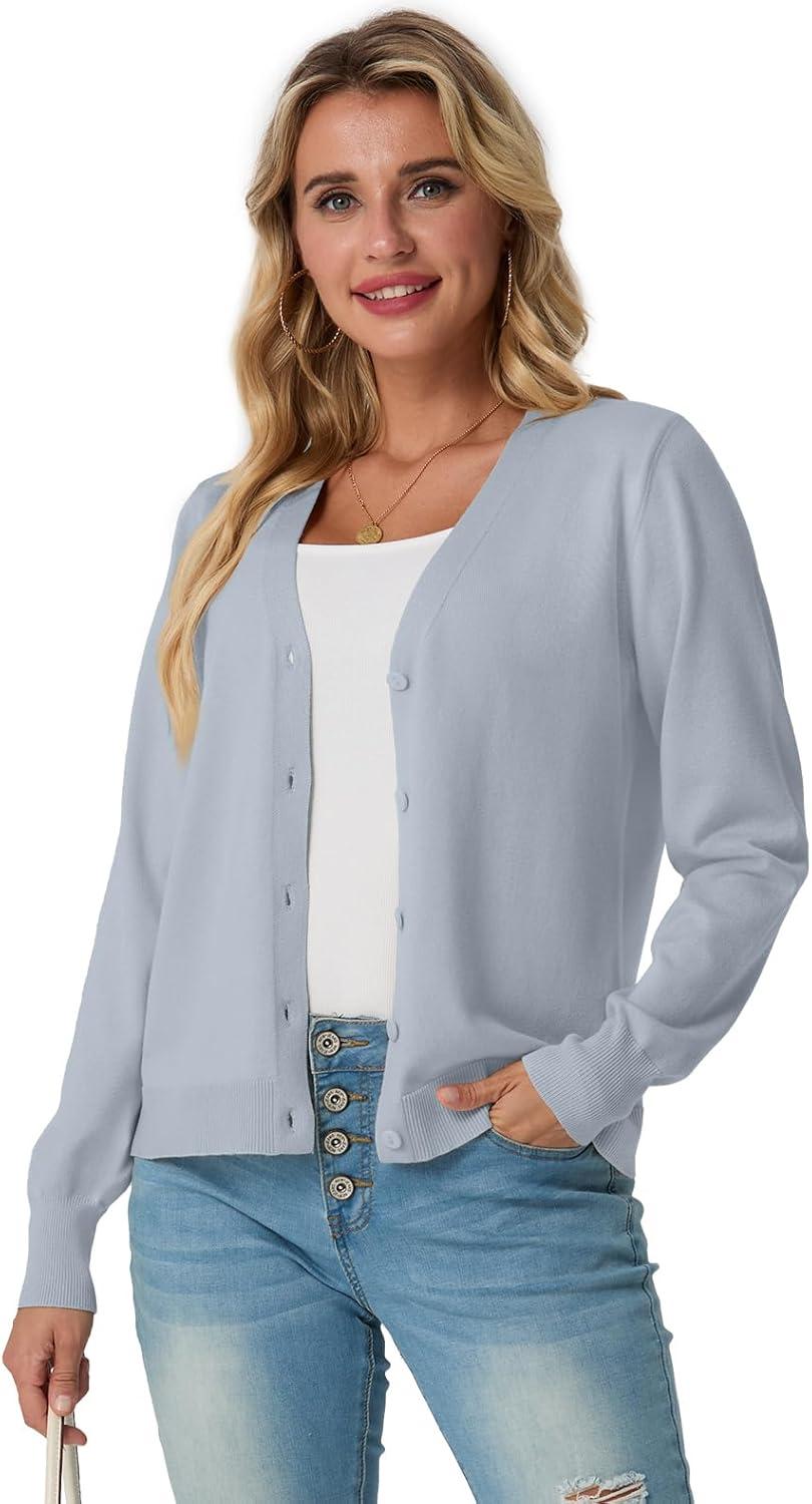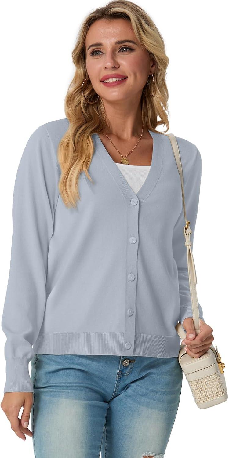 GRECERELLE 2025 Womens Lightweight Open Front Long Sleeve Casual Button Down V-Neck Cardigan Sweater (S-2XL)(Grey Blue)