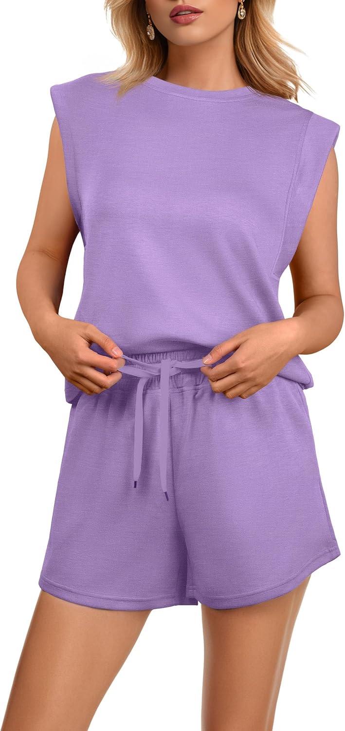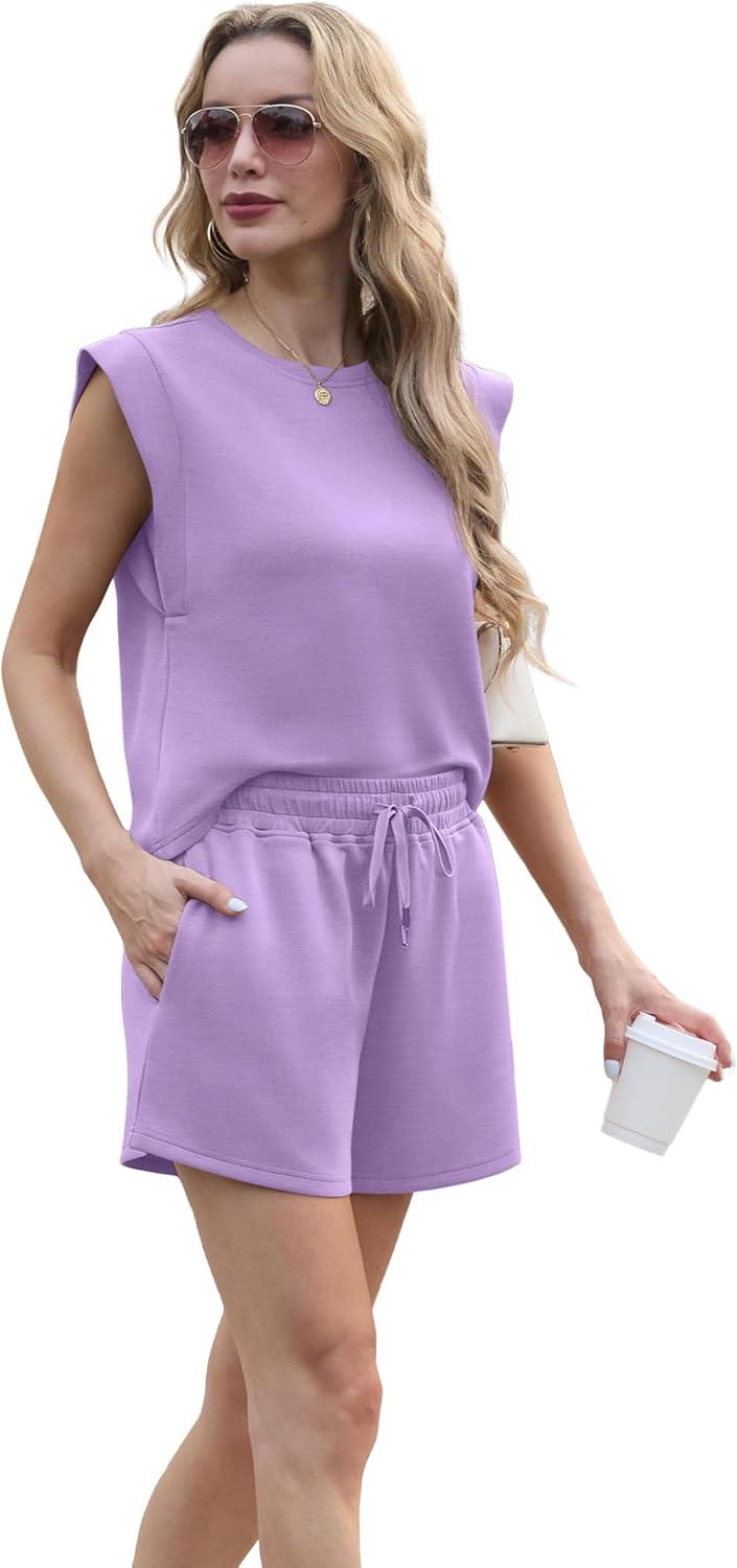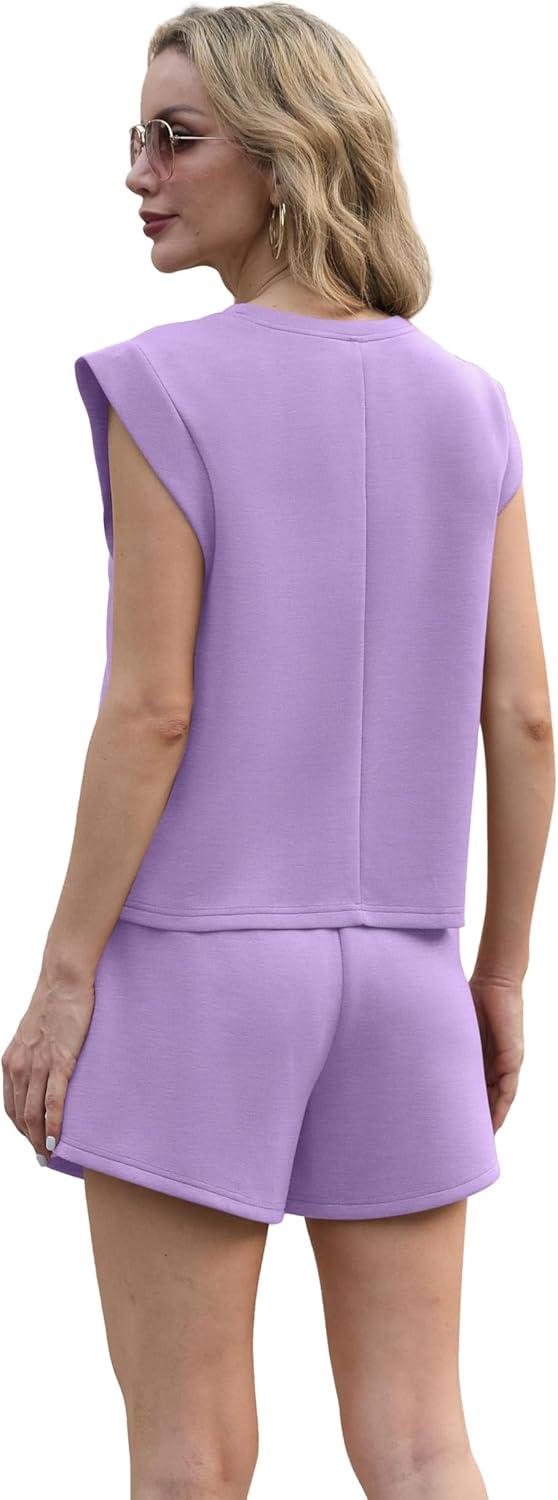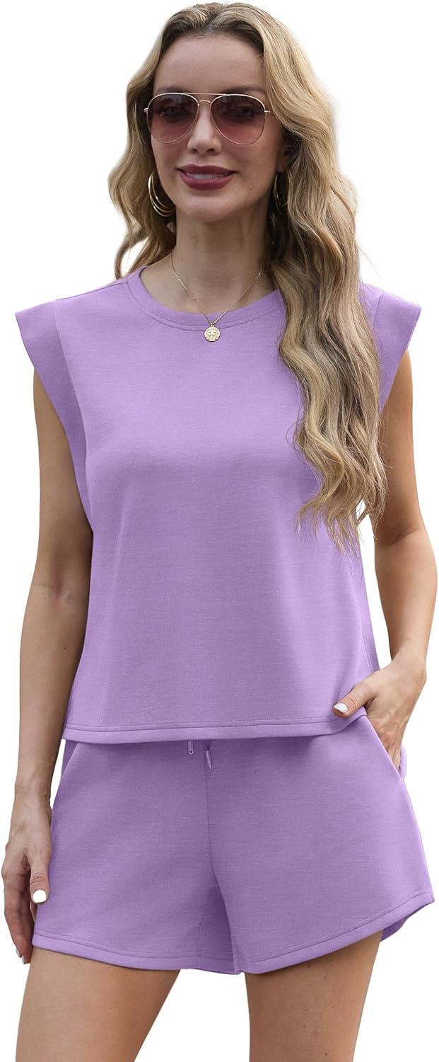 GRECERELLE 2025 Women’s Summer 2 Piece Outfits Round Neck Cap Sleeve Top with Pocket Short Sets(Lilac)