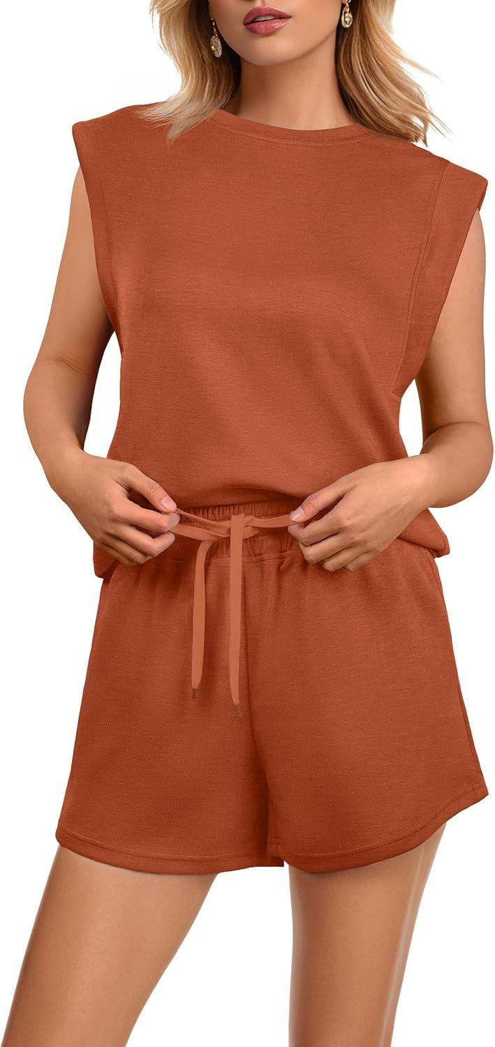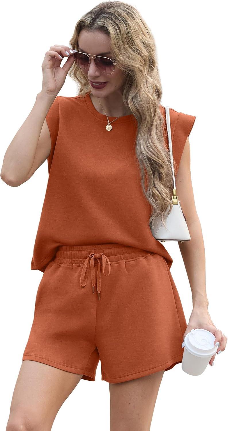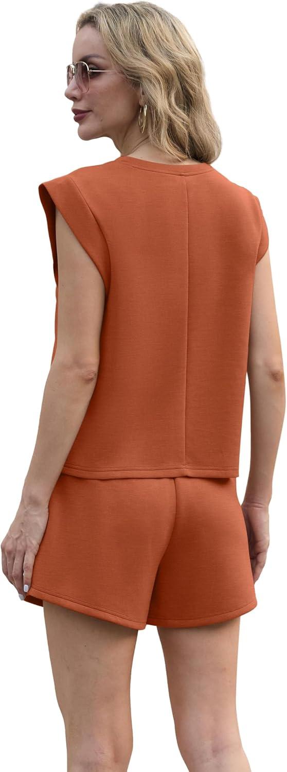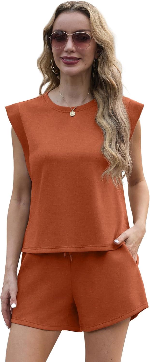 GRECERELLE 2025 Women's Summer 2 Piece Outfits Round Neck Cap Sleeve Top with Pocket Short Sets(Tan)