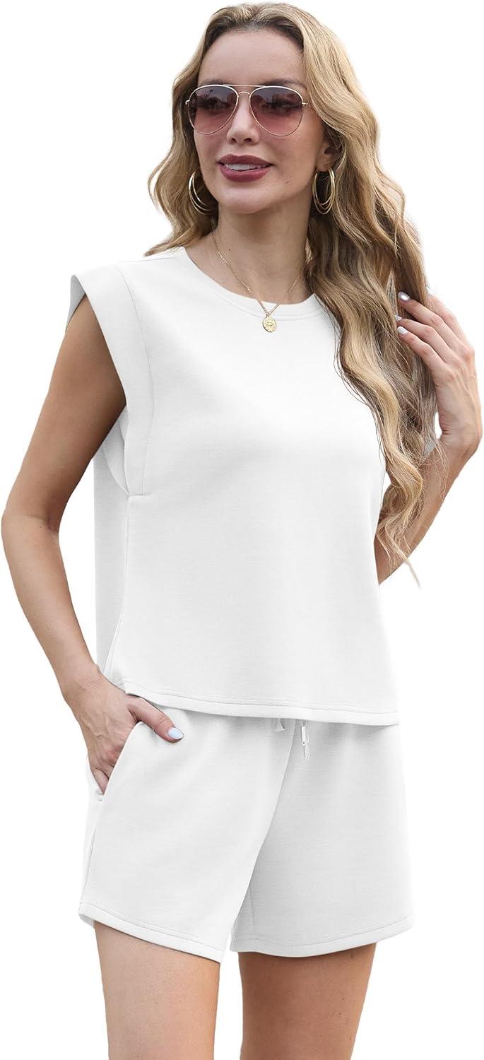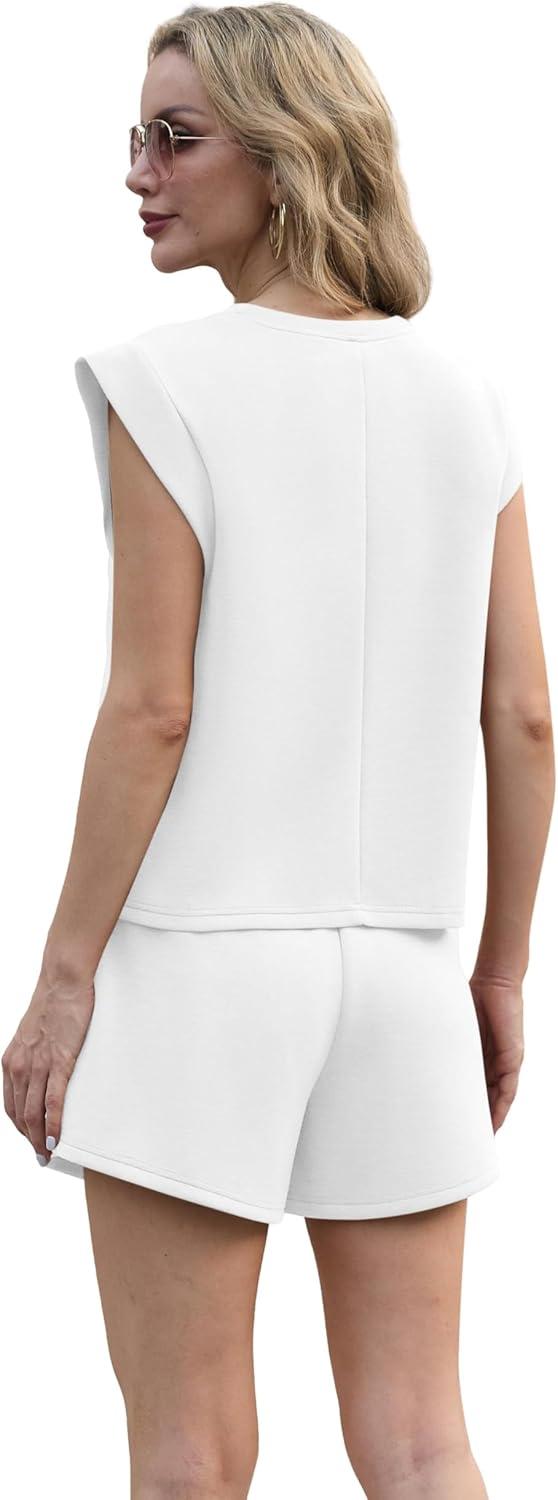 GRECERELLE 2025 Women’s Summer 2 Piece Outfits Round Neck Cap Sleeve Top with Pocket Short Sets(White)