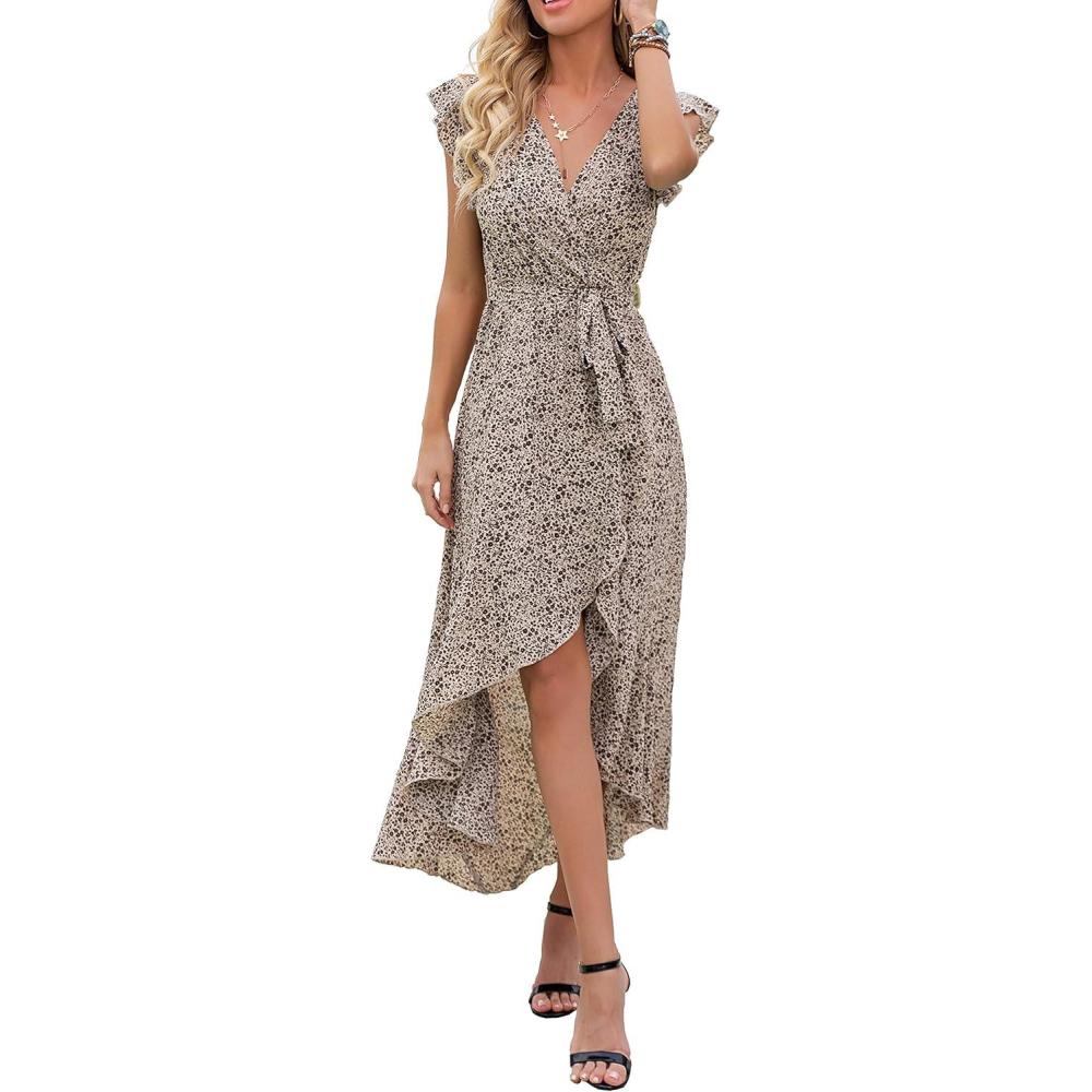 GRECERELLE 2026 Women’s Spring Summer Boho Floral Print V-Neck Faux Wrap Maxi Dress for Wedding Guest, Graduation, Party(03 Fp Floret Coffee)