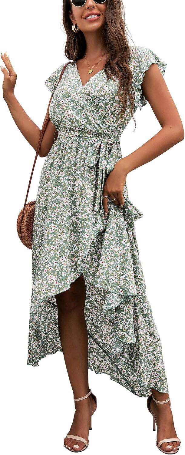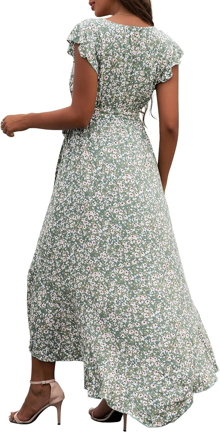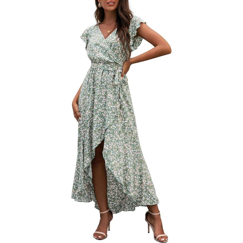 GRECERELLE 2026 Women’s Spring Summer Boho Floral Print V-Neck Faux Wrap Maxi Dress for Wedding Guest, Graduation, Party(13 Fp Lily Green)