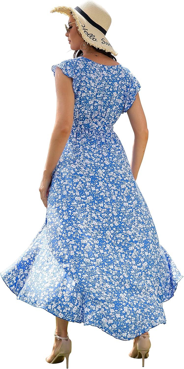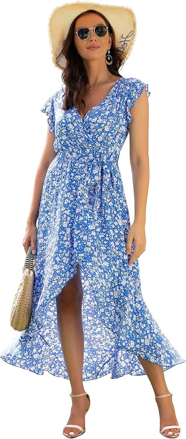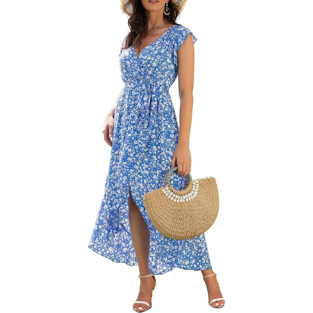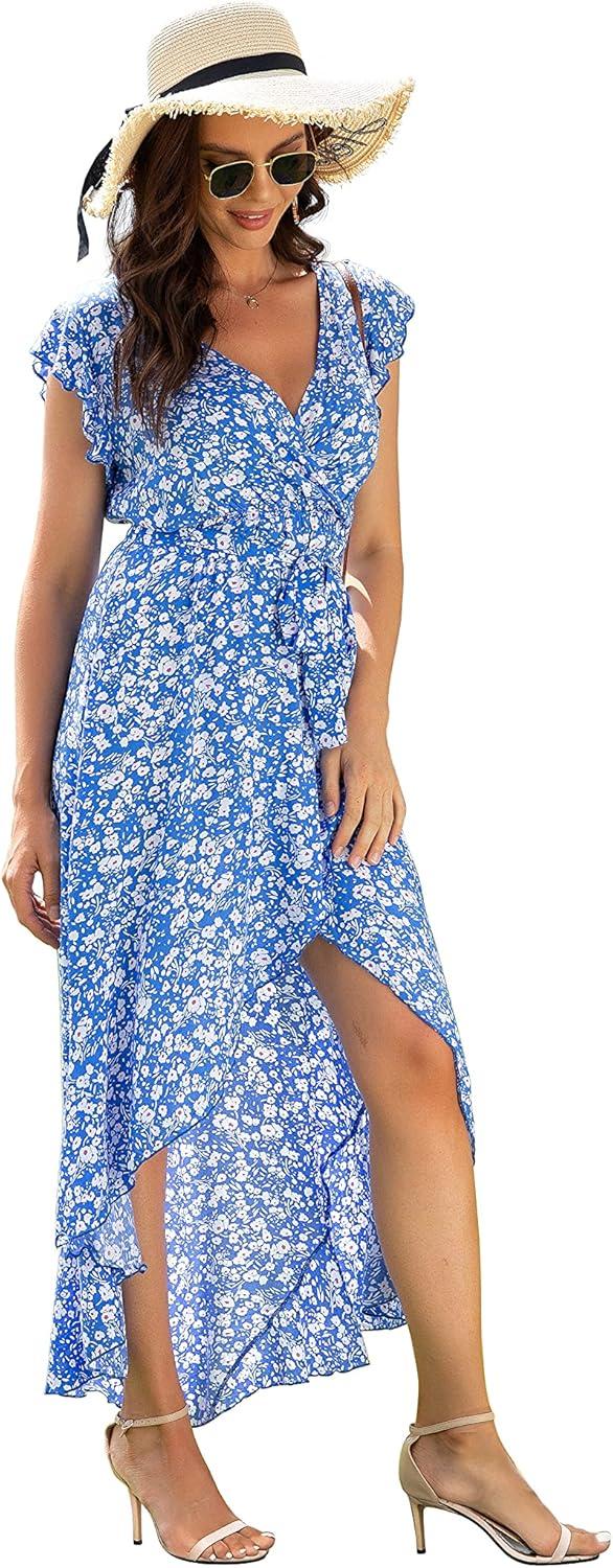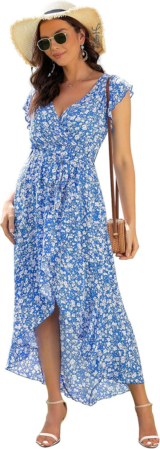 GRECERELLE 2026 Women’s Spring Summer Boho Floral Print V-Neck Faux Wrap Maxi Dress for Wedding Guest, Graduation, Party(18 Polka Dots-royal Blue)