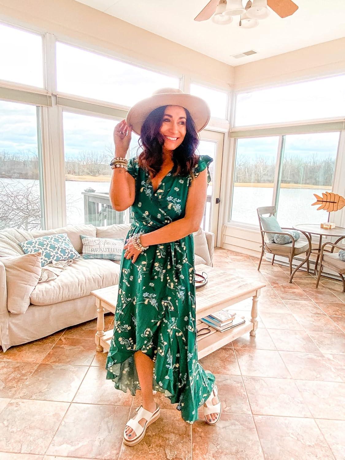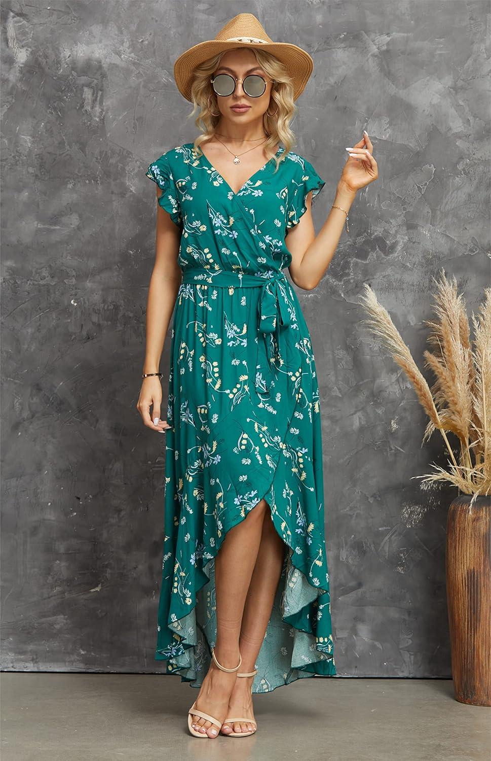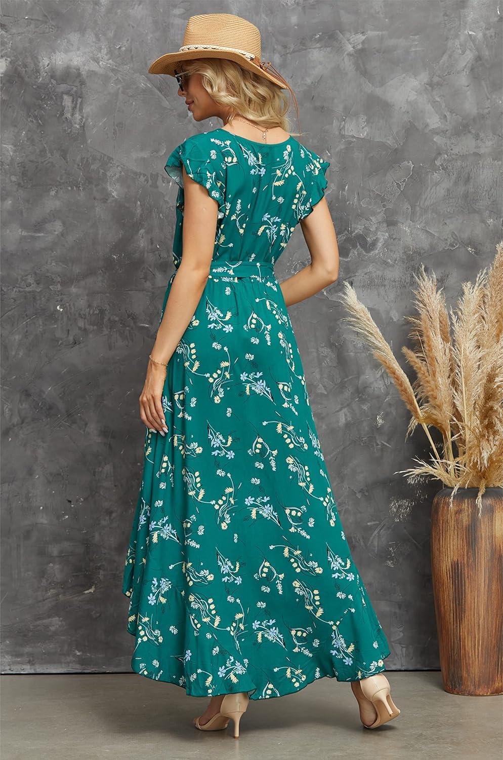 GRECERELLE 2026 Women’s Spring Summer Boho Floral Print V-Neck Faux Wrap Maxi Dress for Wedding Guest, Graduation, Party(19 Fp Dark Green)