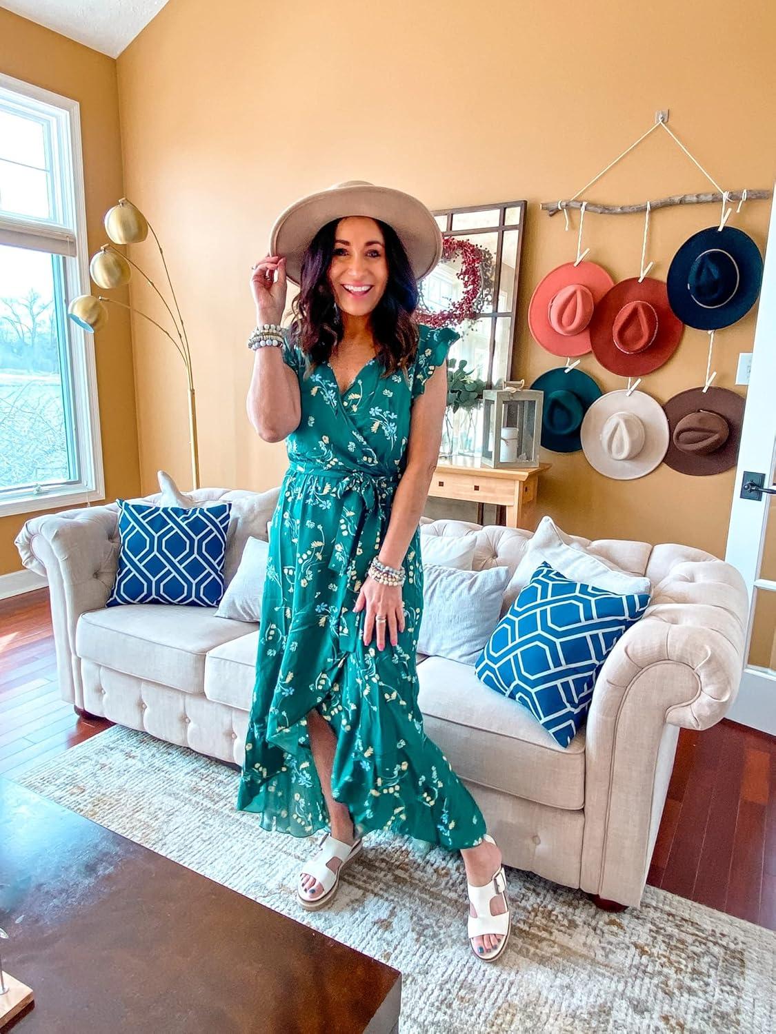 GRECERELLE 2026 Women's Spring Summer Boho Floral Print V-Neck Faux Wrap Maxi Dress for Wedding Guest, Graduation, Party(19 Fp Dark Green)