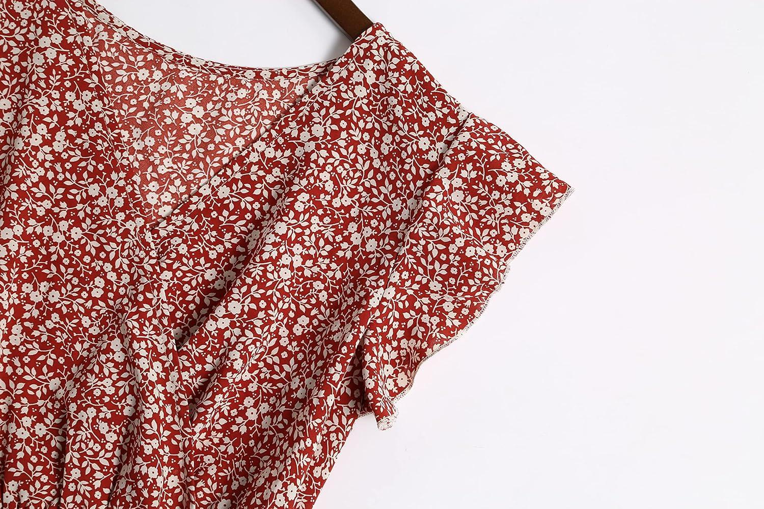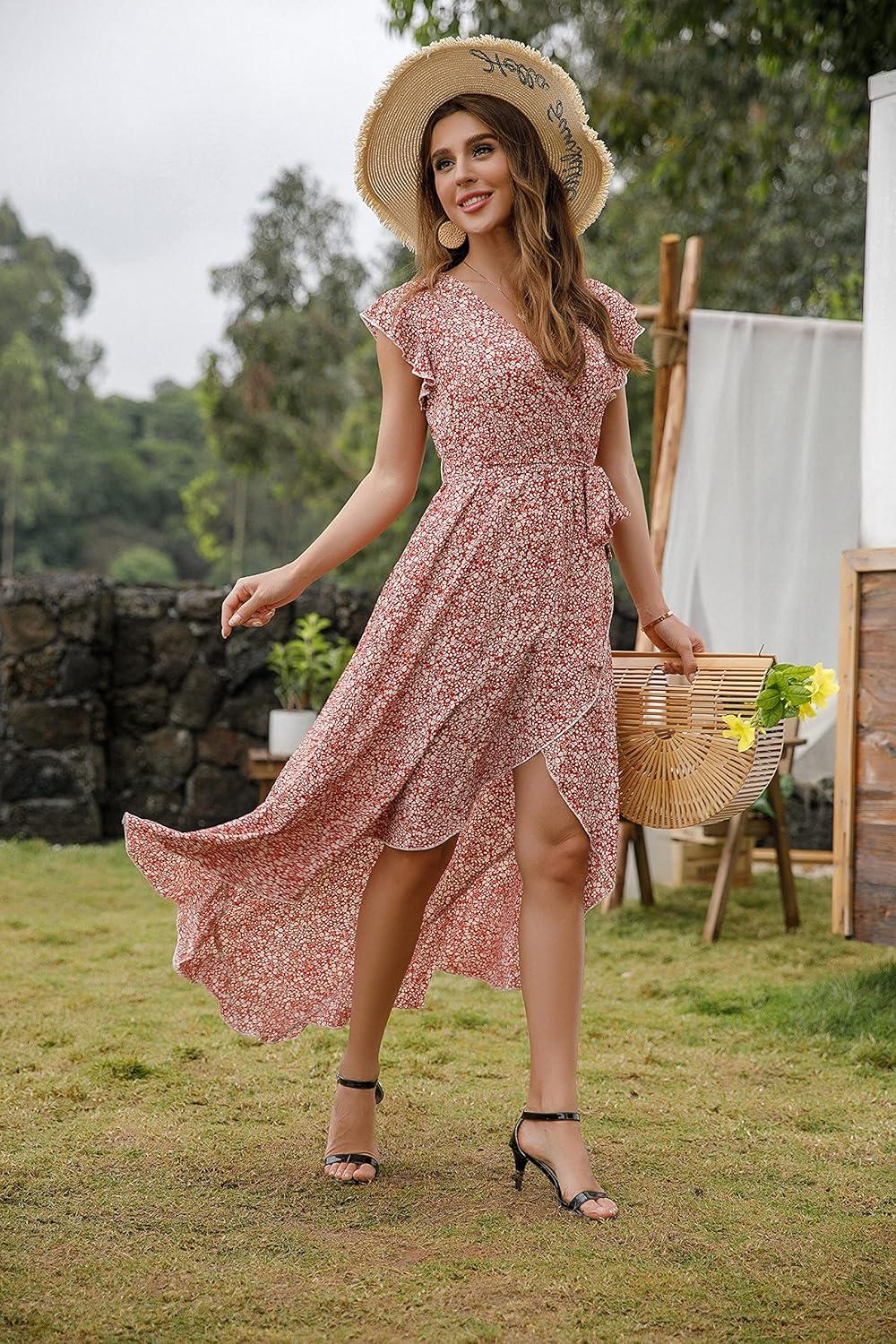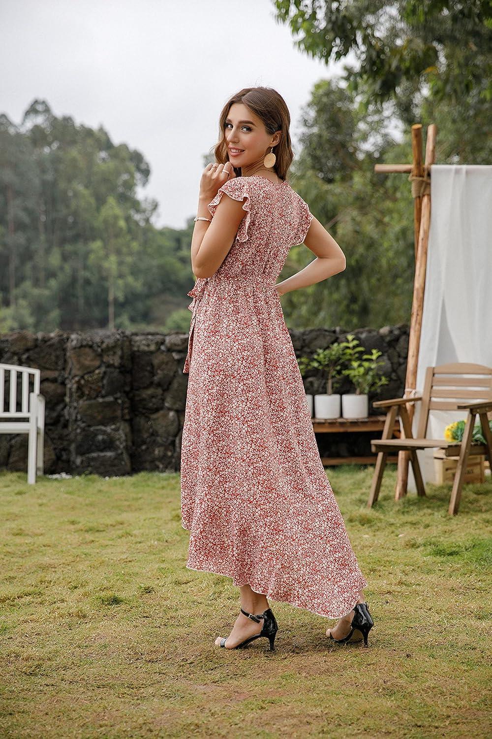 GRECERELLE 2026 Women’s Spring Summer Boho Floral Print V-Neck Faux Wrap Maxi Dress for Wedding Guest, Graduation, Party(23 Fp Floret Red)