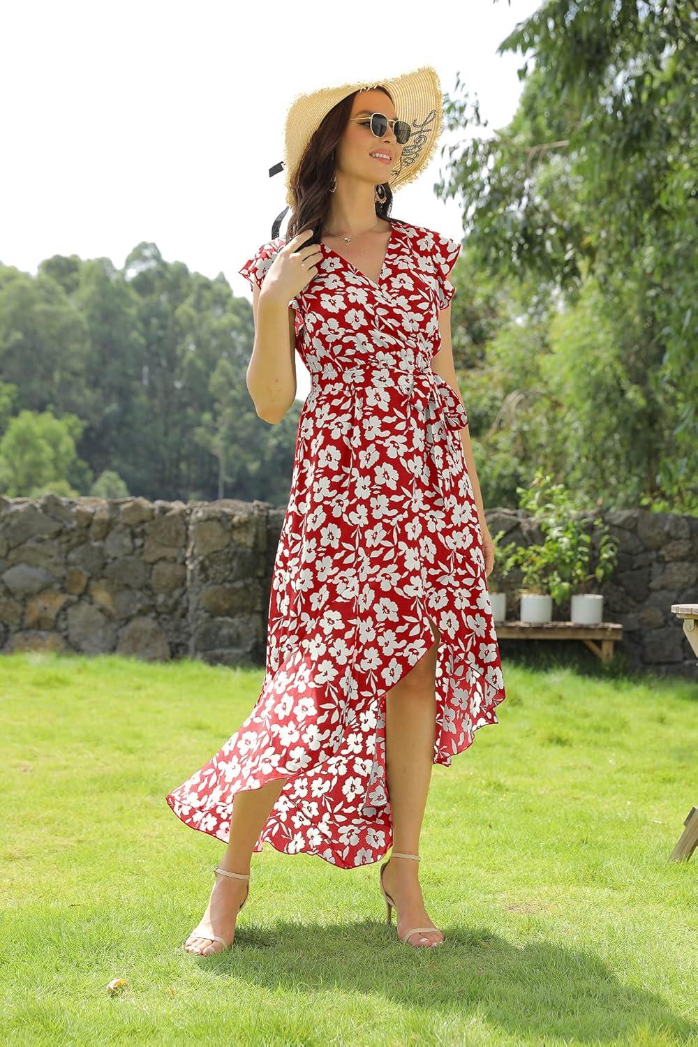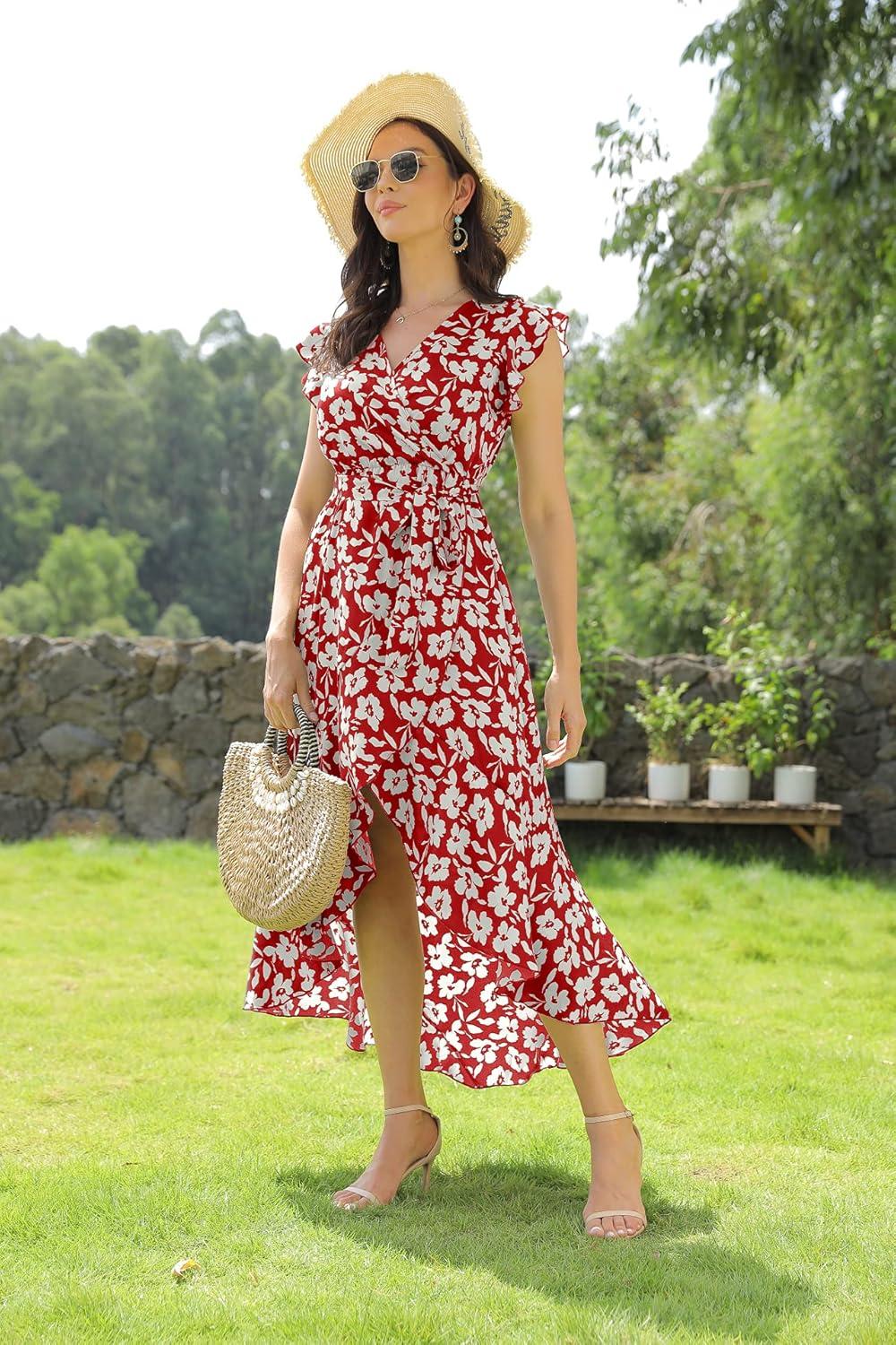 GRECERELLE 2026 Women's Spring Summer Boho Floral Print V-Neck Faux Wrap Maxi Dress for Wedding Guest, Graduation, Party(25 Fp Big Lily Red)