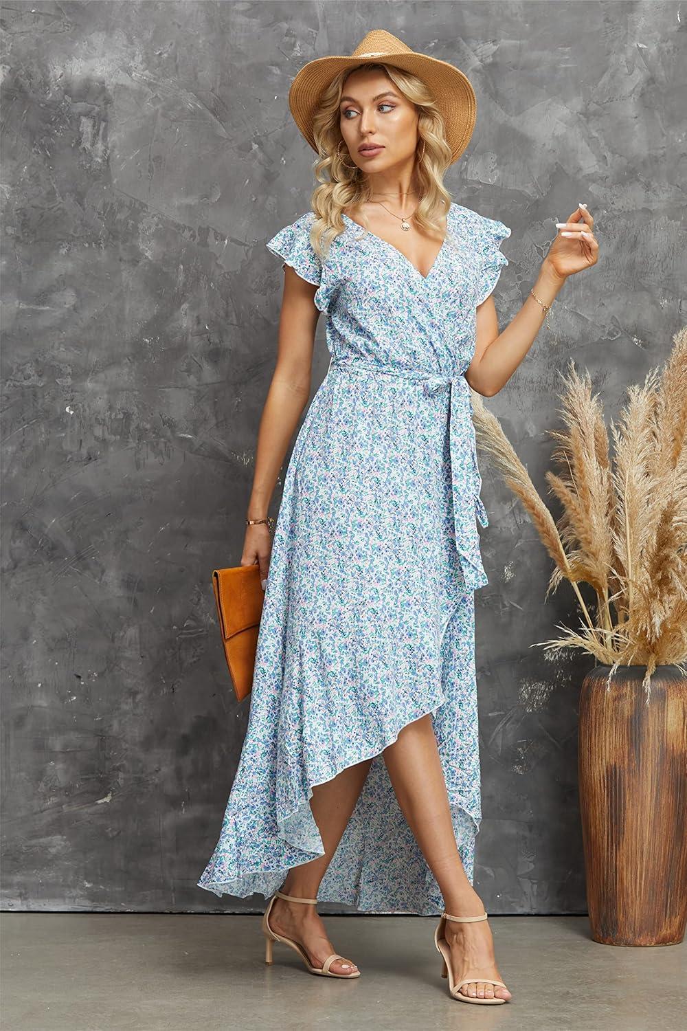 GRECERELLE 2026 Women's Spring Summer Boho Floral Print V-Neck Faux Wrap Maxi Dress for Wedding Guest, Graduation, Party(26 Fp Floret Blue)